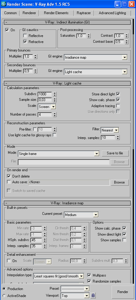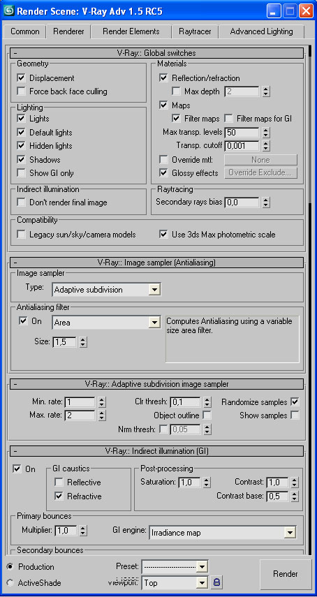 No te olvides nunca en la pestaña de global switches, de desactivar las luces por defecto del 3ds Max, y que las luces que pudieses ocultar, no funcionen en el render. Son default lights y hidden lights.