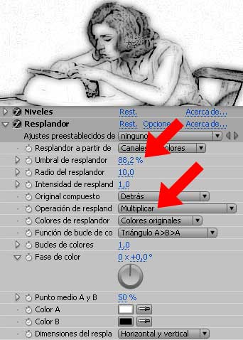 6. Aplica el efecto estilizar/resplandor. Aumenta el ¨umbral de resplandor¨ a +/- 88 y asegúrate que la opción ¨operación de resplandor¨ sea multiplicar.