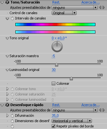8. Al video original aplica tono/saturación con los valores saturación maestra:-5 y luminosidad original:30. Aplica también desenfoque rápido con difuminación de 35.