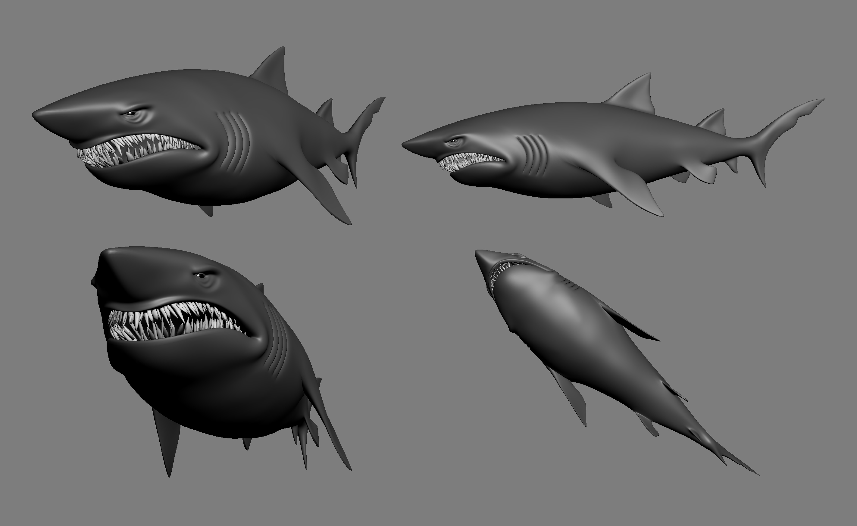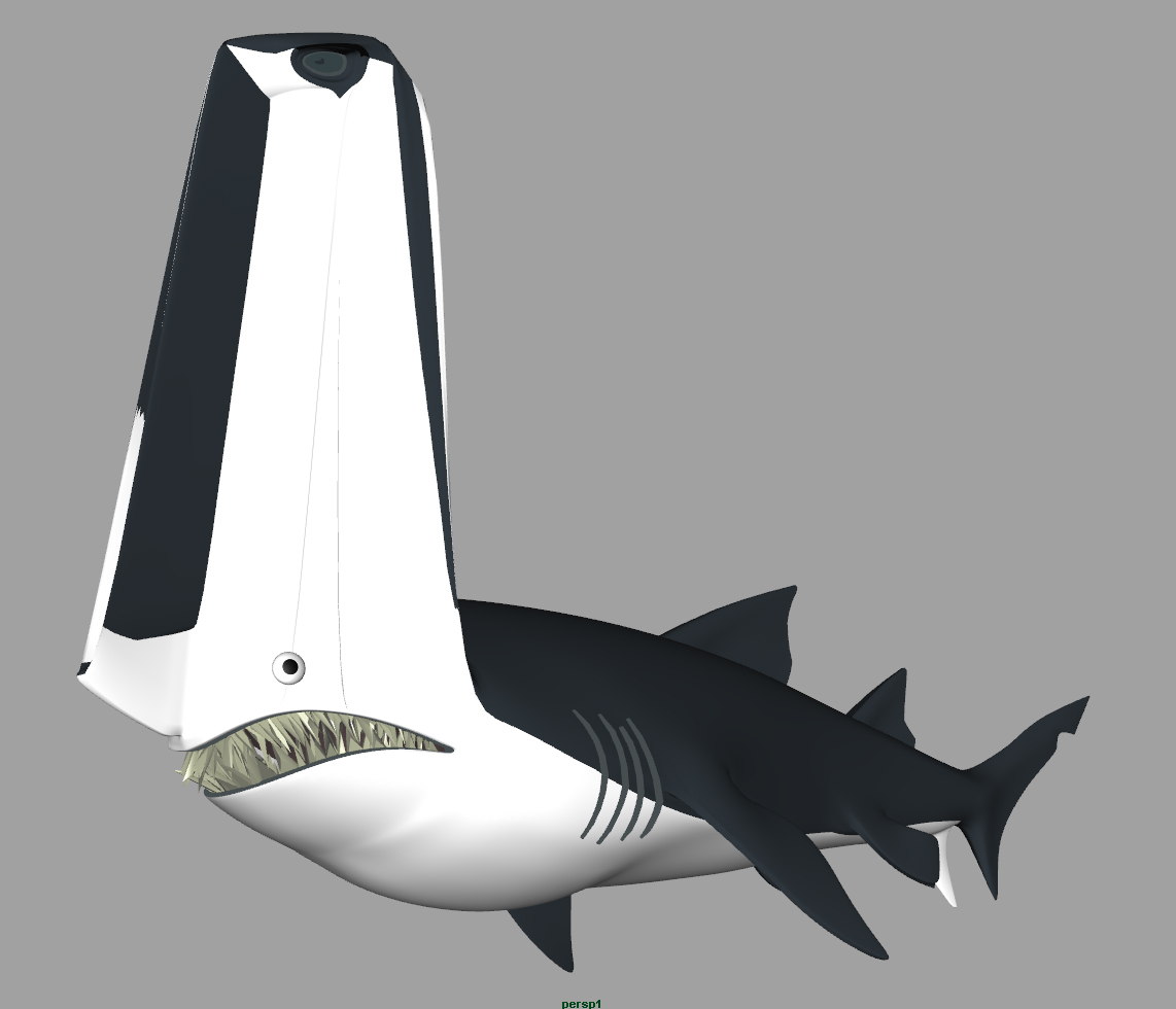 Total que le arranqué la cabeza al tiburón, se la modelé junto con las aletas y branquias (que estaba modeladas como geometría aparte y yo quiero todo en una malla para riggear y skinear todo de una pieza).
