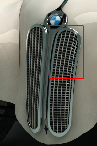 En primer lugar, volver a felicitarte por tu trabajo, que más quisiera yo que mis coches salieran con esa calidad. El fallo al que me refería es el siguiente, observa en la imagen los alambres horizontales de la rejilla, esta levemente difuminados, no sé si aplicaste algún desenfoque en Adobe Photoshop, o la rejilla no está modelada si no que es una textura y no acaba de tener la resolución adecuada.