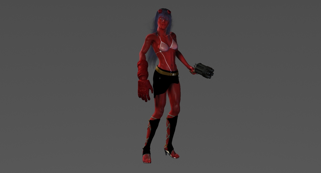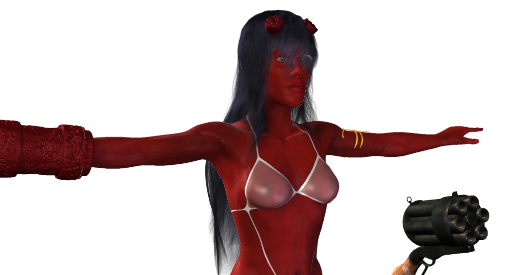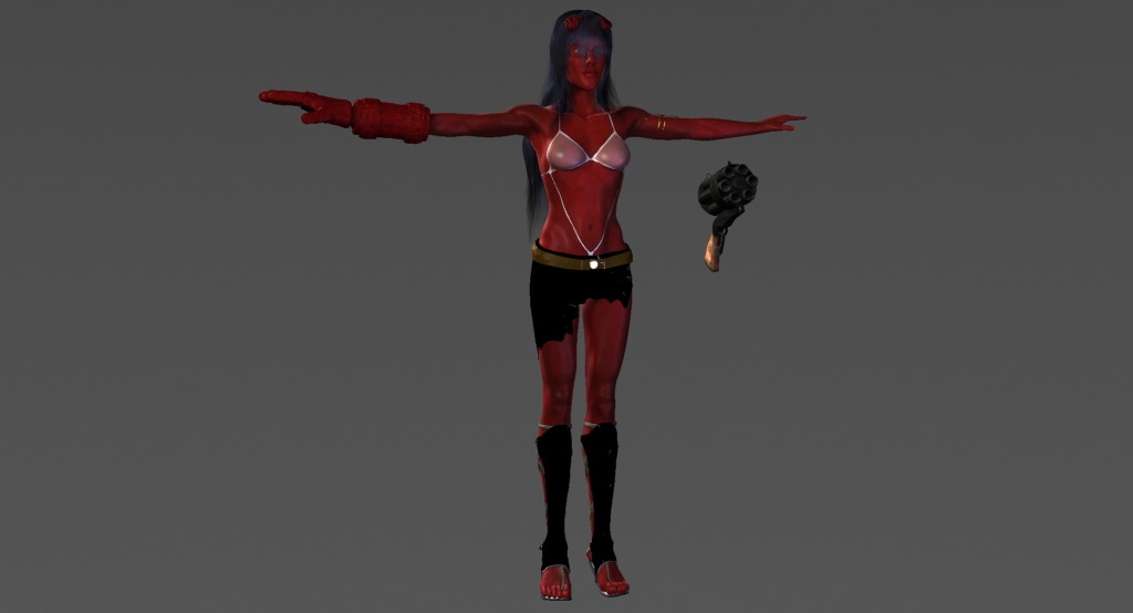 Hola a todos, me llamo Eduardo y soy de Perú, bueno, soy un usuario antiguo que recién se decide empezar a publicar, voy a empezar con un trabajo personal que estoy haciendo ahora, y es, que estoy haciendo la versión femenina de Hellboy, empecé el modelo en 3dsMax, luego hice el detallado y texturizado en ZBrush, aún no término por eso la iluminación es básica, incluso aún no tiene piso porque como dije, está en proceso, le voy a agregar un piercing en la nariz y empezaré a hacer el rigging, intentaré hacer un rigging facial en Softimage (no lo se usar, pero a ver qué sale pues de algún modo debo aprender a usar ese software que me parece super guay).