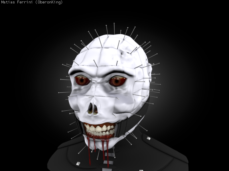 Guapísimo el tío, lástima que veo mucha diferencia entre el detalle de modelado que tiene, por ejemplo, la boca, la sangre y esa correa comparado con la cabeza. Los cortes del coco de pinhead te quedarían de coña modelados con un poco de detalle. Saludos.
