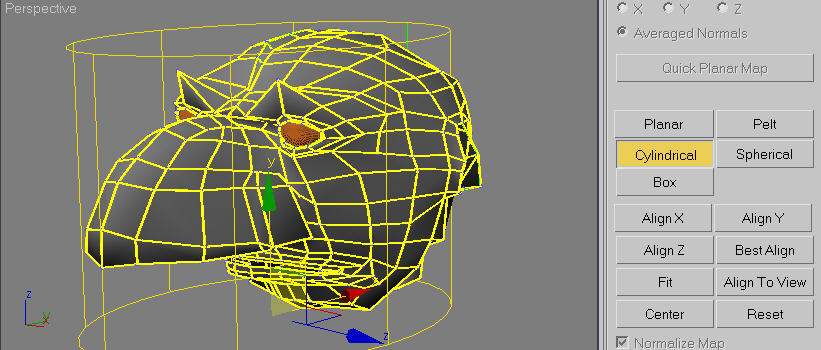 -Con los polígonos seleccionados creo un modificar Unwrap, voy a Faces, selecciono todas las Faces, y añado un mapa cilíndrico, fijado en las caras: