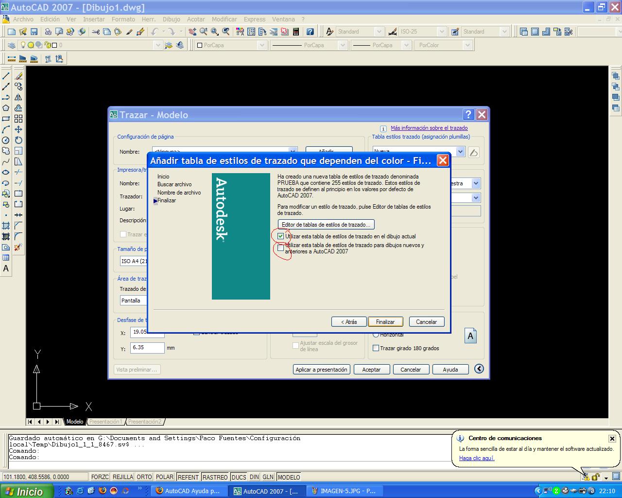 5ª imagen: selecciona lo que prefieras, la de arriba es: utilizar esta tabla de estilos en el dibujo actual y la segunda utilizar esta tabla para dibujos nuevos y anteriores.