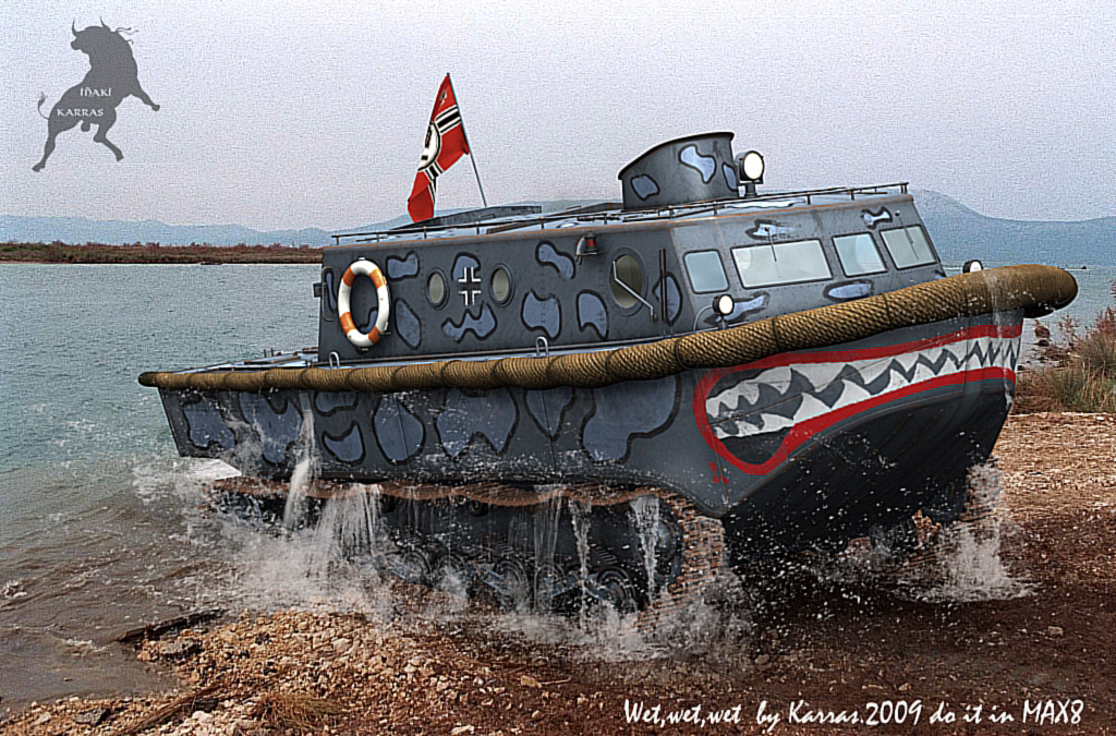 Lo dejamos así, a ver si se seca. Anfibio alemán de la 2º guerra mundial modelado en 3dsMax 8. Editado : desaturado y por favor ya me contaras lo del corte donde esta.