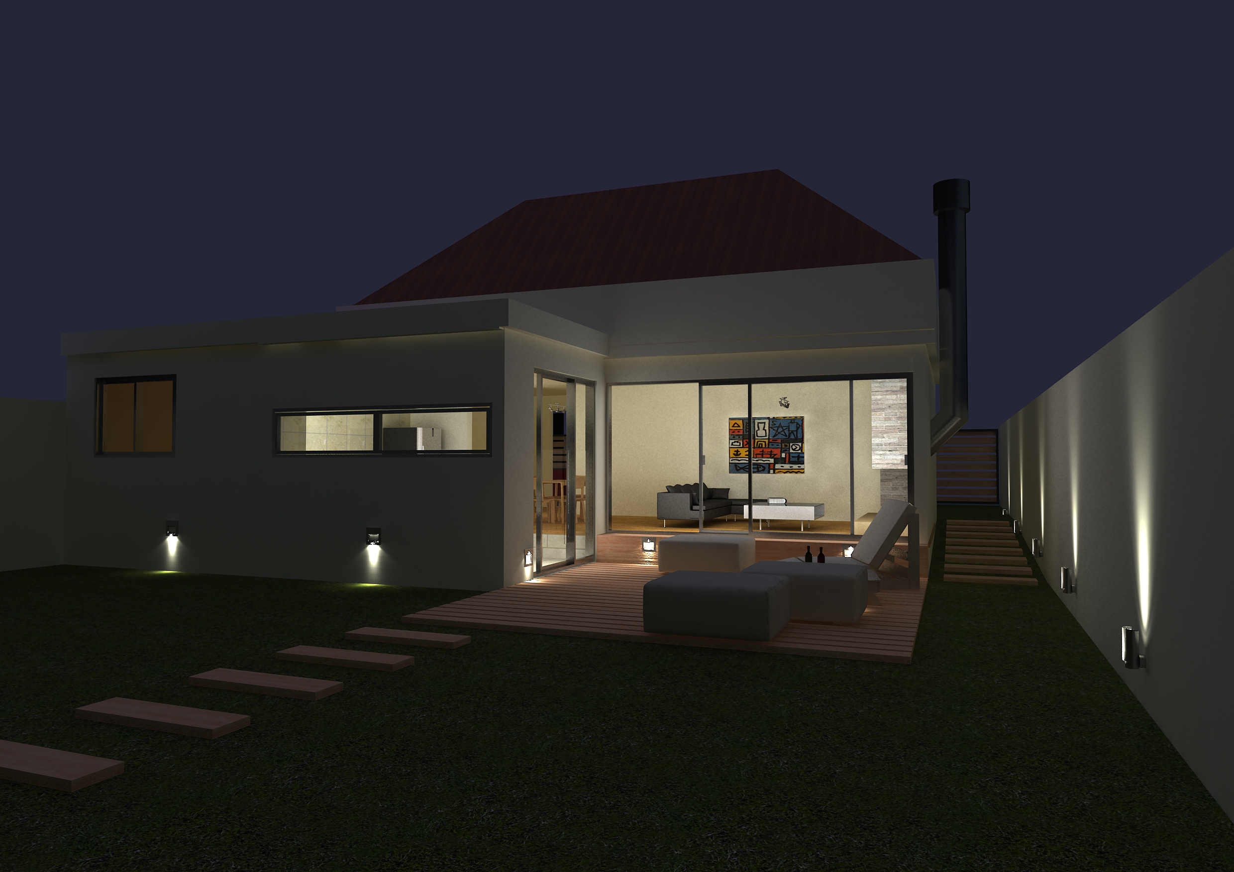 Coincido con alexin86 los detalles dan realismo a una imagen, el ángulo de la cámara no creo que te favorezca mucho, en el pasto deberías ocupar displecement o Vray Fur está muy chato, el caño de ventilación de la chimenea está muy grueso no crees? En las tejas te recomiendo que modeles una con medidas exactas y las coloques, no me convence el fondo, un map HDRI nocturno creo que te caería mejor, abría que mejorar la textura de los sillones y almohadones, al igual que el deck, parece que le has dado mucho espesor, un map madera marrón oscuro le haría mejor al mismo. No te olvides de las plantas. Saludos.