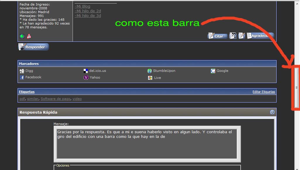 Gracias por la respuesta. Es que ha mi e suena haberlo visto en algún lado. Y controlaba el giro del edificio con una barra como la que hay en la derecha de la pantalla, pero en horizontal. Le das a la barra hacia la izquierda y el edificio gira a la izquierda y así. Entonces se llama scroll ¿eh? Voy a mirar en san Google un poco, lo de meter el flash en el pdf. Gracias.