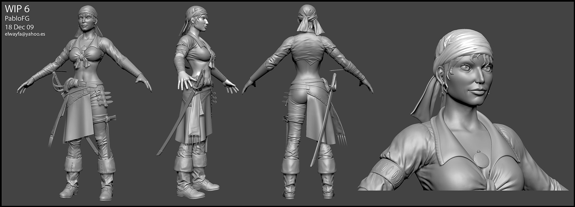 Vale. No se me ocurre ningún nombre y ando escaso de imaginación. Una chica pirata-rogue (válgame la originalidad) estilo semi-cartoon, destinada a tiempo real cargado 10-15 k y a texturas pintadas a mano.