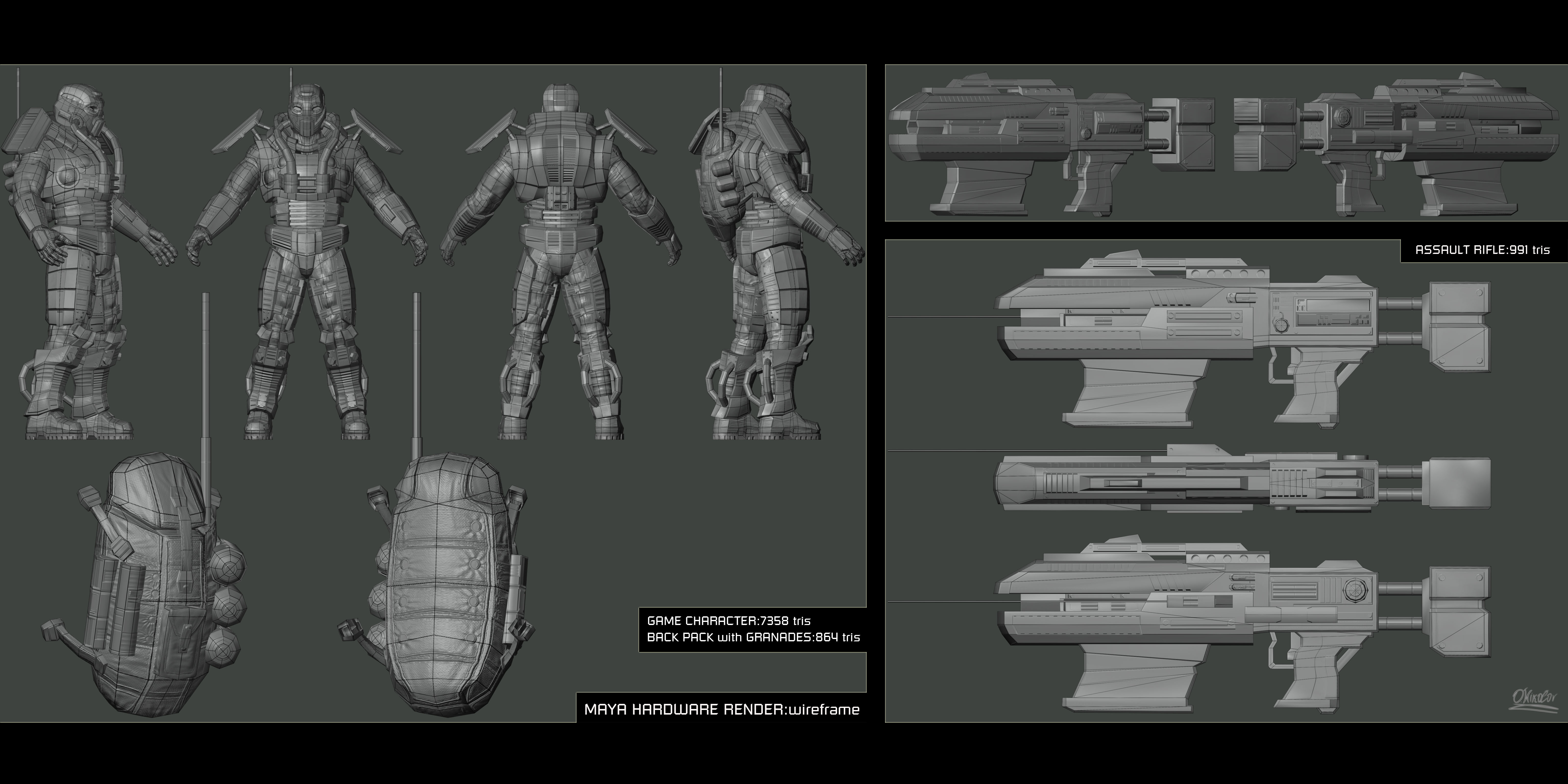 He conseguido adelantarme a enseñar algo antes de que se acabe el año. Me atrevo con algo Low poly. Mas bien es como un personaje secundario del tipo que te puedes permitir variación de textura y llenar la escena de ellos para que te ataquen y por esto me puse un pequeño límite para el personaje y el arma (la cual esta pensada ser vista desde tercera persona)modelado en Maya, (la ropa y ralladuras en ZBrush), textura en Adobe Photoshop y render en el Marmoset Toolbag. Algunos veréis que algunos de los renders me han salido un poco secos y como Skin Shader en el metal, pero es porque el Marmoset solo puede guardar renders en 24bits Targa sin transparencia. Por esto tenía que poner un fondo claro en el programa (en mi caso rosa)para poder quitarlo en Adobe Photoshop y quedarme solo con el personaje en limpio, pero por lo visto al usar este método el fondo si que pone algo de luz no deseada al personaje. Algunos de los renders se ven mejor. Y como quitamos algún que otro artefacto en las sombras escucho más críticas. Ojalá os guste.