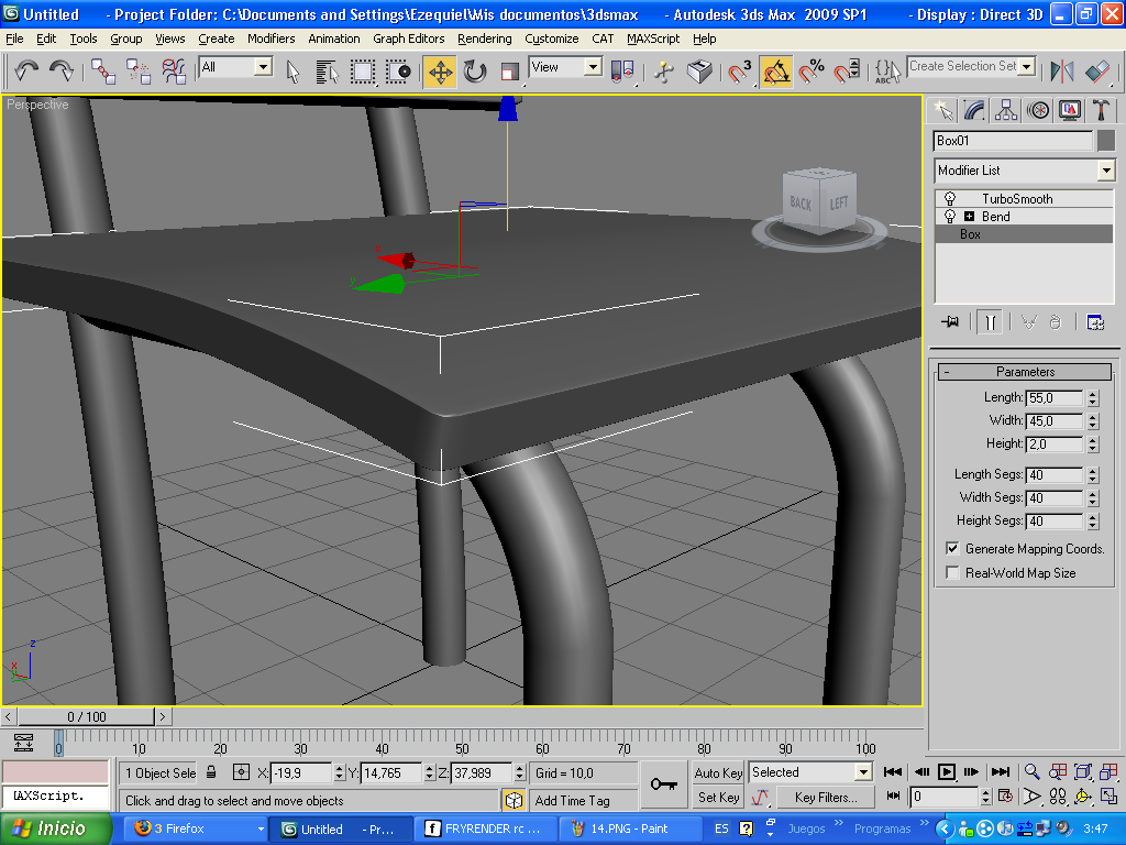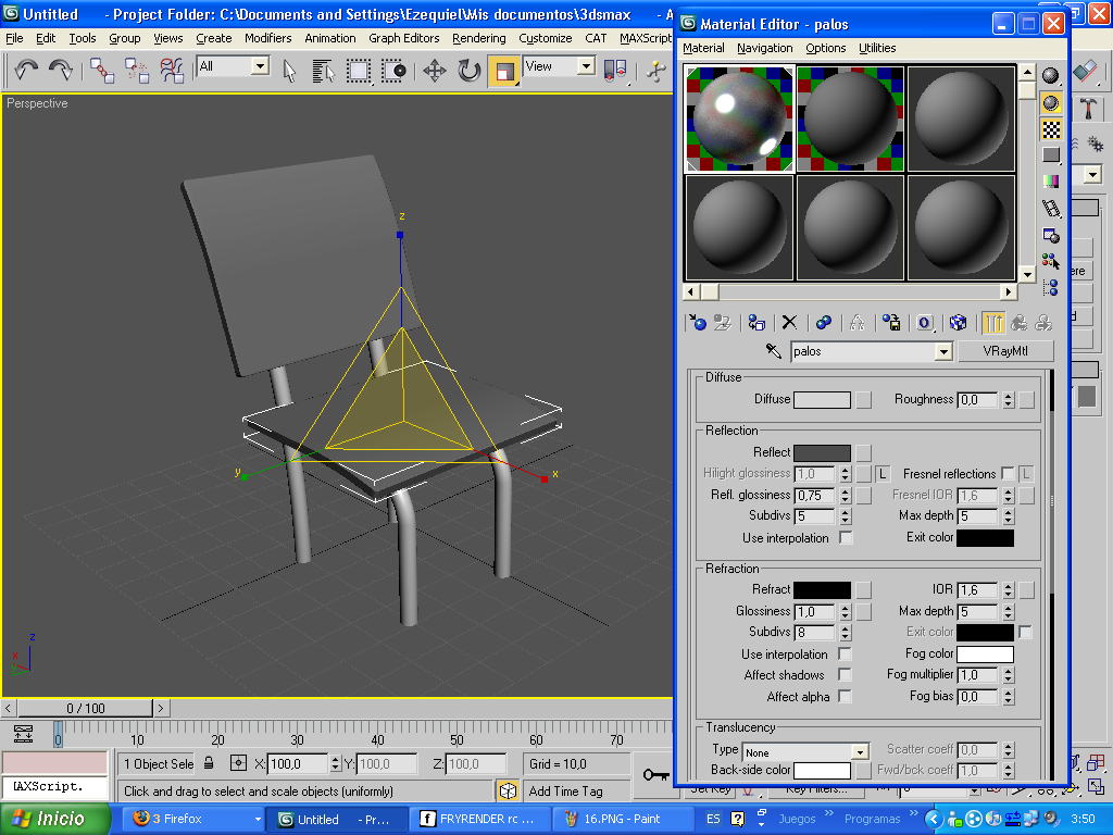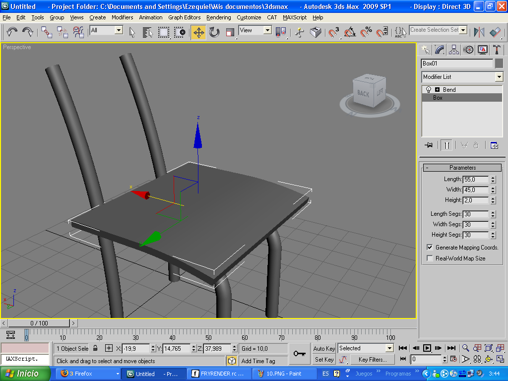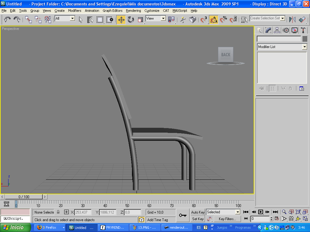 Yo ya tengo la silla casi acabada =d=d. Lo que pasa que tengo una duda. Al renderizar el objeto, ¿cómo se le puede añadir un plano que haga la función de suelo? Es decir, que en ese plano se pueda, por ejemplo, trabajo la sombra de en este caso la silla.