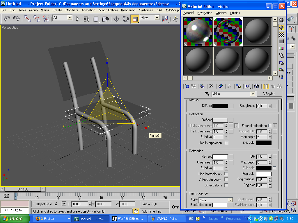 Les dejo a ustedes el tema de la iluminación y otras cosas, eso es para que ustedes vean, sino avisen y yo les dejo un super preset para el Vray que te tarda un montón en renderizar, obviamente podemos jugar con los parámetros y hacerlo más real, y también podemos editar la distorsión que tenga la refracción como ponerle un Bump map o algo. También le podemos poner más detalles como remaches entre el vidrio y los palos agregarle más cosas, etc. Porque me parece que queda como si se estuviera solo con los palos. Que les vaya bien.