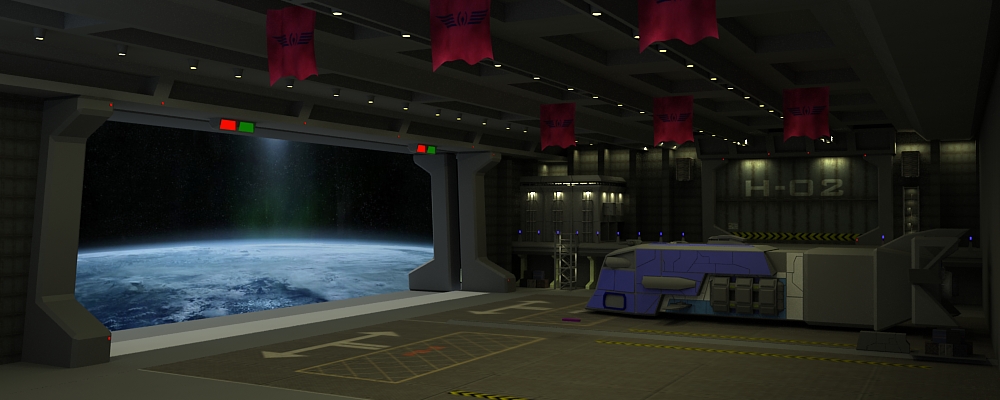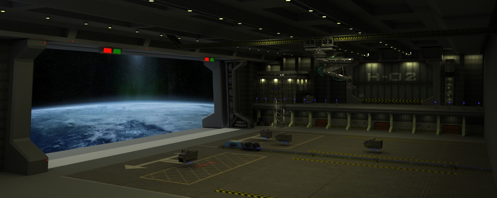 Update del hangar sin la nave, con algunos detalles más, creo que ya he conseguido mejor darle esa sensación de amplitud enorme que quería.