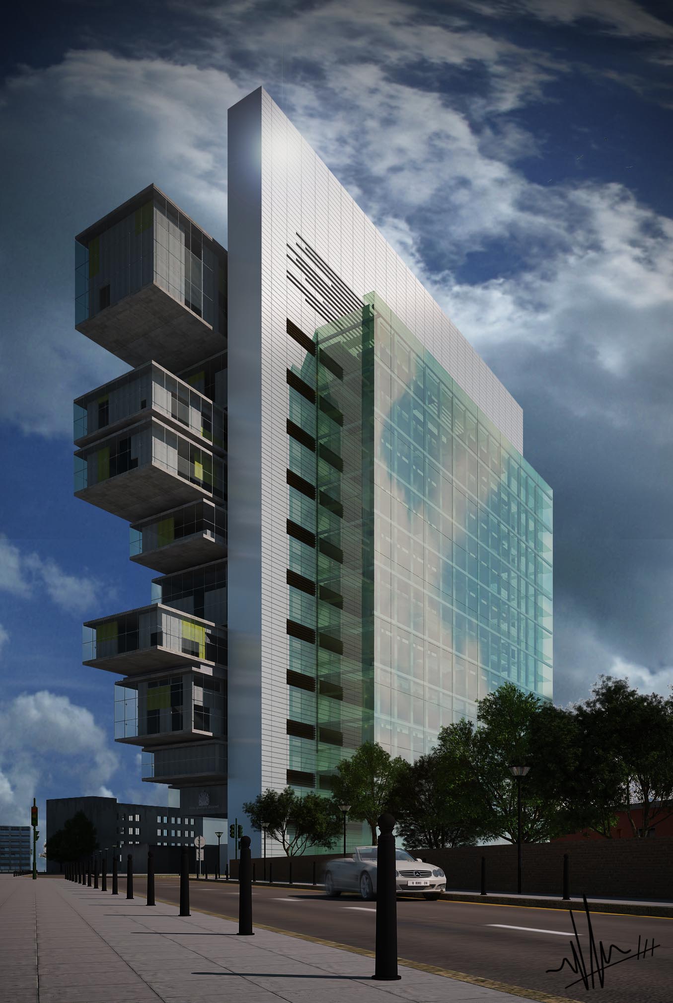 Hola yameconoces. Lo de retirar el edificio pequeño hacia atrás es realmente por ser fiel a la imagen que tomé como referencia, ya que el edificio como puse anteriormente, es el centro de justicia de Manchester, que ya está heho. Me impresionó y lo tome como modelo para hacer el render.