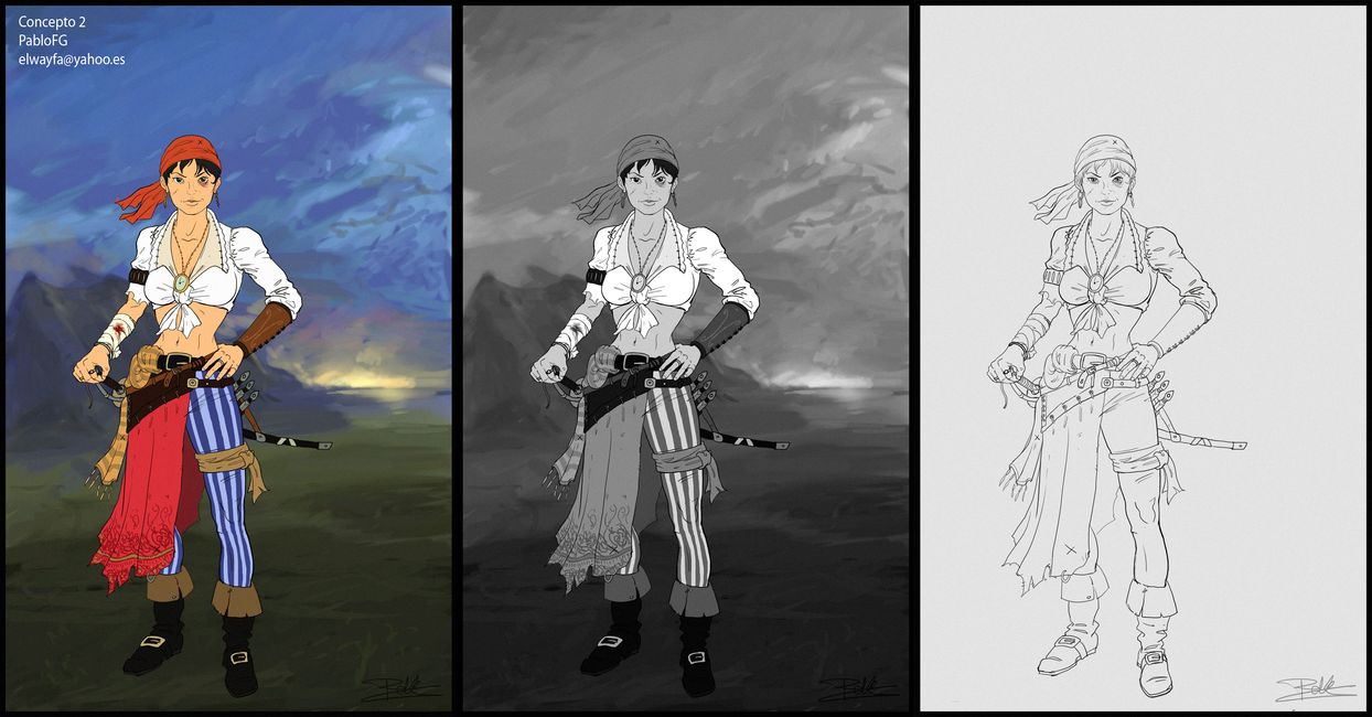 El concept original, que hice antes de empezar, con guía de color, y unos screens del ZBrush y el color vertex por polypaint, más que nada colores bases y unas gradientes para ayudar los volúmenes.