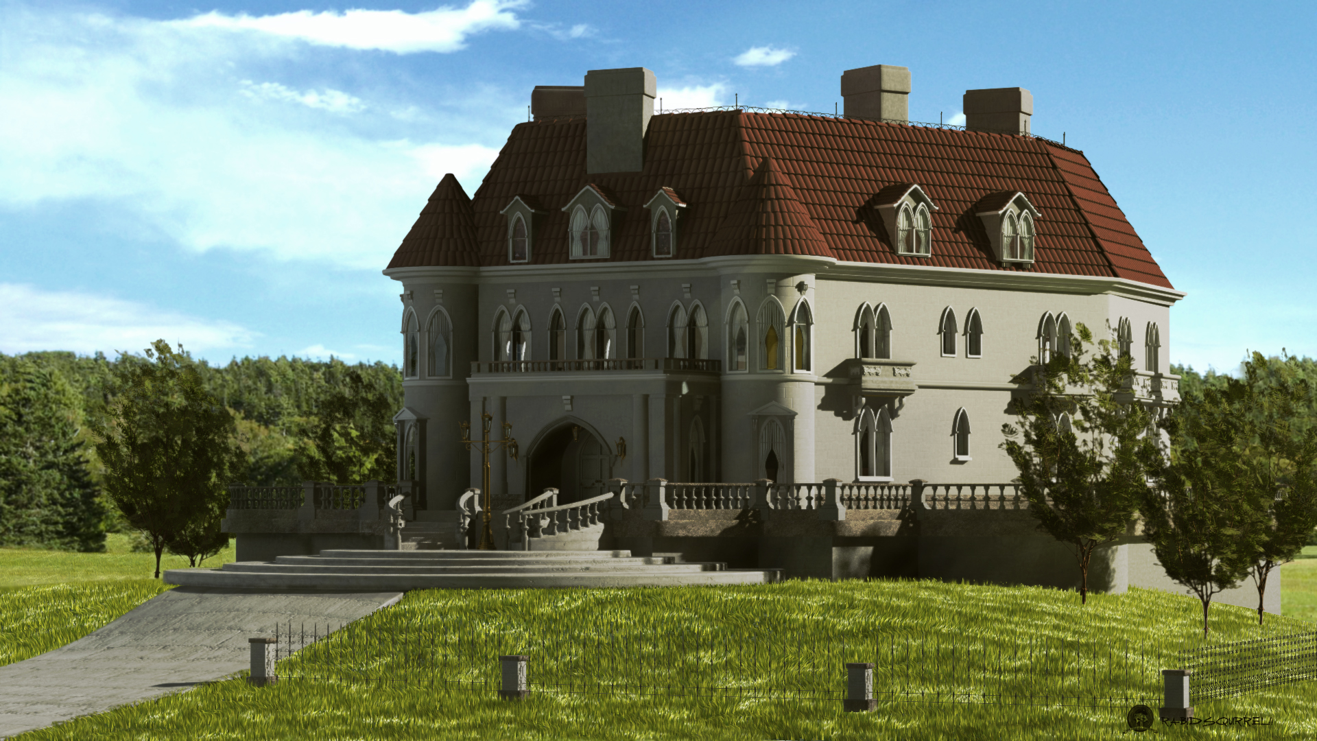 Bien empecemos: primero felicidades te ha quedado muy bonito. Bien ahora pasamos a las críticas constructivas: para ser gótico no veo del todo correcto el uso de tejas coloniales, el pasto queda como pelo, utiliza la herramienta Vray Fur o Grass-o-matic para el pasto porque lo que más desencaja es esto, prueba primero bajarle el tamaño, deberías de dibujar, aunque sea en phosohop las sombras de esos árboles en el pasto que supongo los pusiste después del render, es decir que renderizaste uno por un lado el edificio y luego el pasto por otro, y por último tu reja, tampoco da sombra sobre el pasto, así como los pilares donde apoyan estas, fíjate que evolution profesional tiene razón el pasto del fondo no tiene nada que ver con el que propones, y por último ese escalon, espero que lo soluciones porque no son cosas tan complicadas y podrían rematar de una manera tan bonita a tu trabajo un saludo grande y espero ver ese trabajo ya terminado hombre. Saludos.