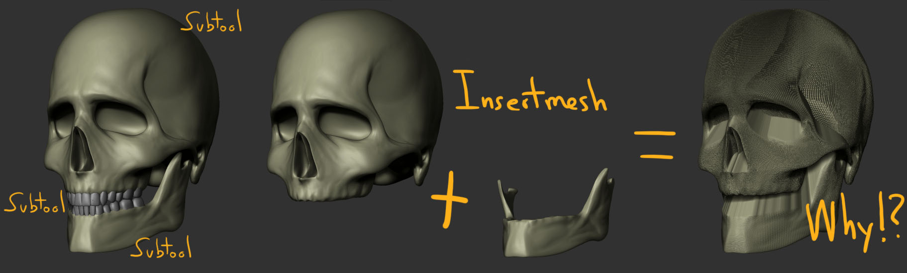 Para empezar deberías usar la última versión de ZBrush, y lo mismo, no entiendo lo que haces con insertmesh, si quieres unir subtool deberías usar merge o el subtool máster.