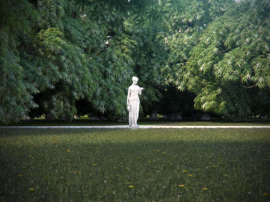 Hola. Me ha gustado mucho la iluminación, está muy conseguida. Por comentarte algo, justo debajo de la estatua, en el límite entre el sol y la sombra, aparece como un desenfoque donde se pierde una parte de la textura del césped y la intensidad de la sombra, no sé a qué se deberá. Un saludo.