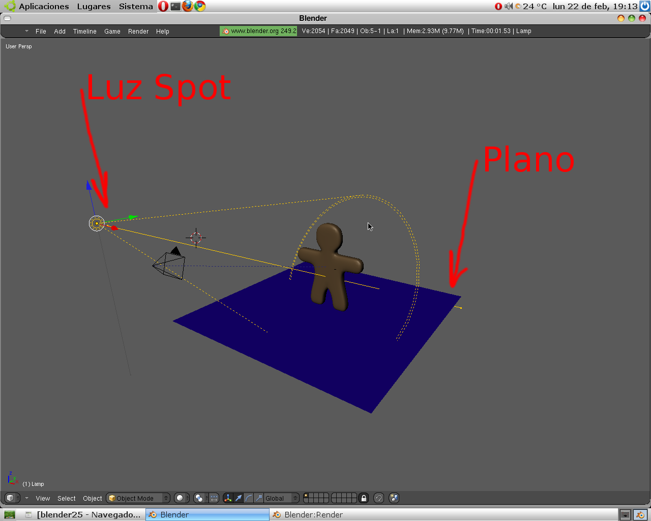 Para la lámpara spot es lo mismo, space y en el menú vas a add -> Lamp -> spot, la rotas y moves hasta dejarla como en la imagen.