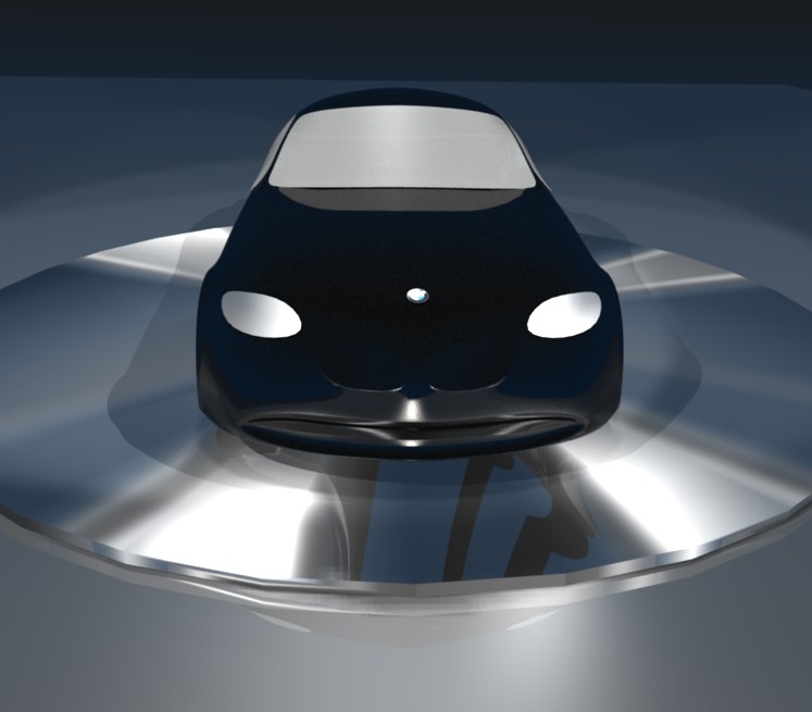 Después, la materialidad. La carrocería está en primera instancia bien, y los neumáticos se los podría trabajar algo mejor, pero no están mal, pero las luces y los parabrisas están muy mejorables. Piensa que estamos hablando de piezas de cristal (por ende transparentes), por lo tanto deberías aprovechar mejor las opciones de transparencia que te ofrece el programa. Probablemente quieras disimular un interior vacío. He ahí la importancia del modelado profundo, por lo pronto, la base en la que pisa el auto. Te diría, la cambias ya, la forma y el material, no ayuda.