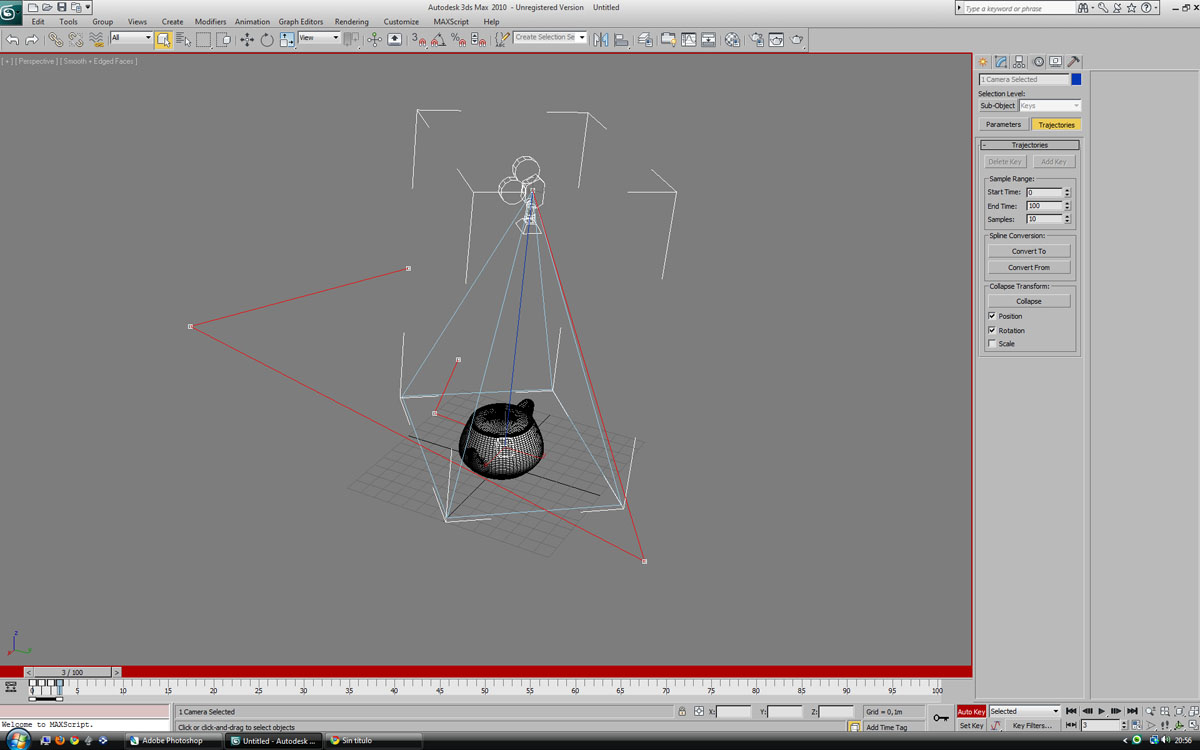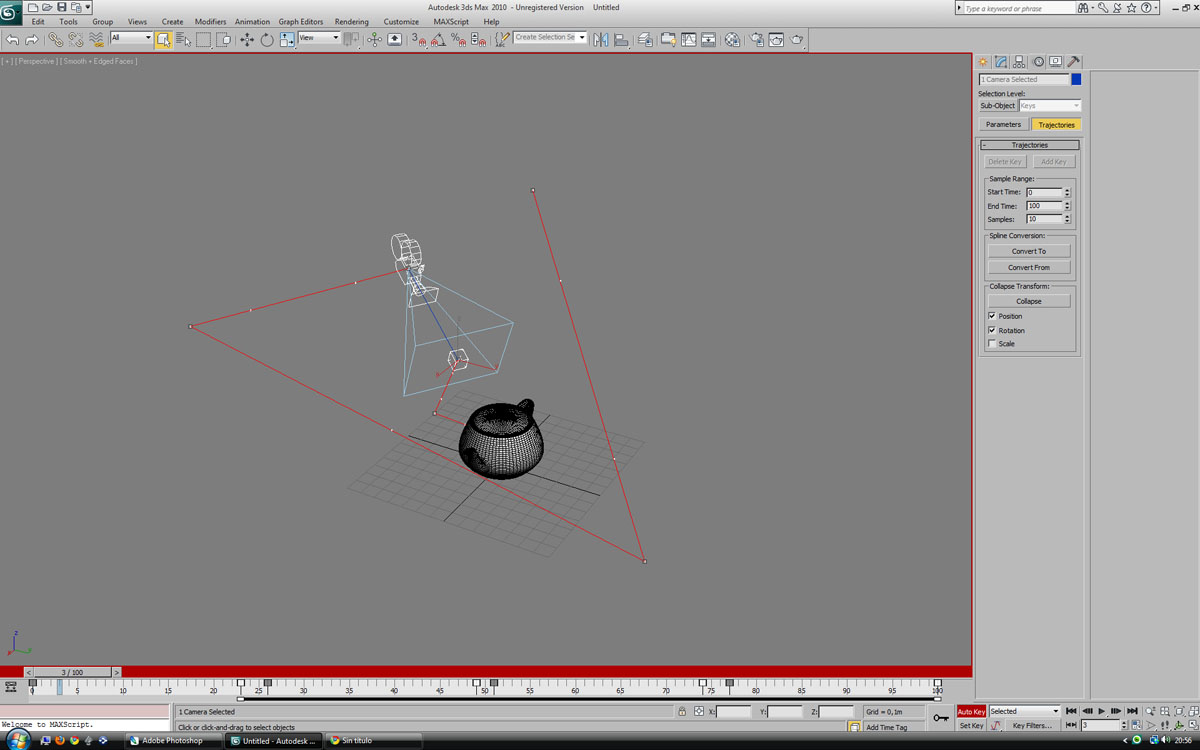 2. Seleccionas la cámara y su objetivo y seleccione las keys de la barra de tiempo.