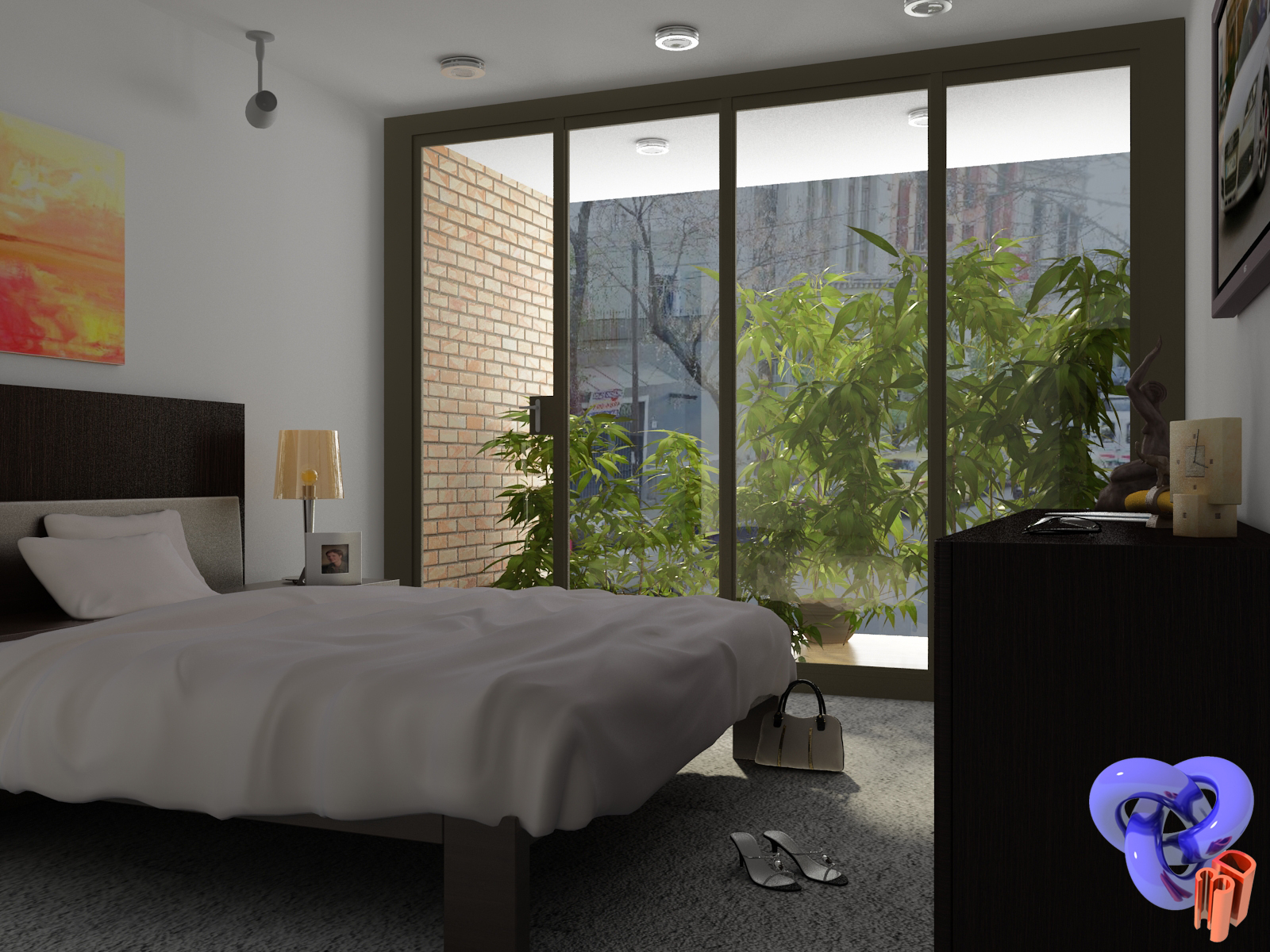 Por otro lado, la imagen exterior es la más floja: cuida el tema de materiales, reduce un poco la iluminación que llega a quemar el primer plano del edificio. También, o no pones ocche o el que pongas cuida de que sea un buen bloque, y no uno pegado en postproducción, que canta bastante en la escena.