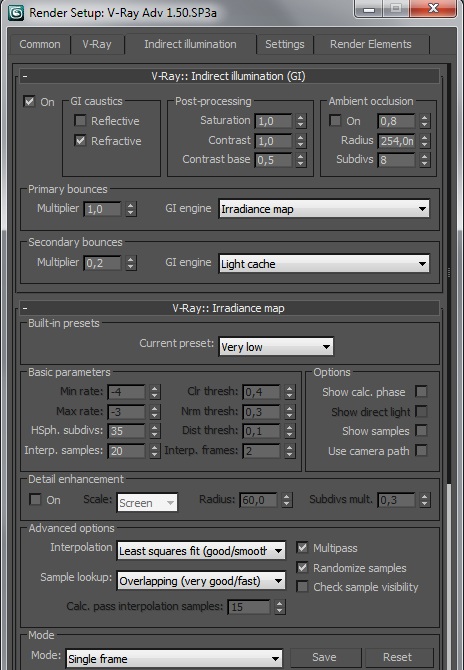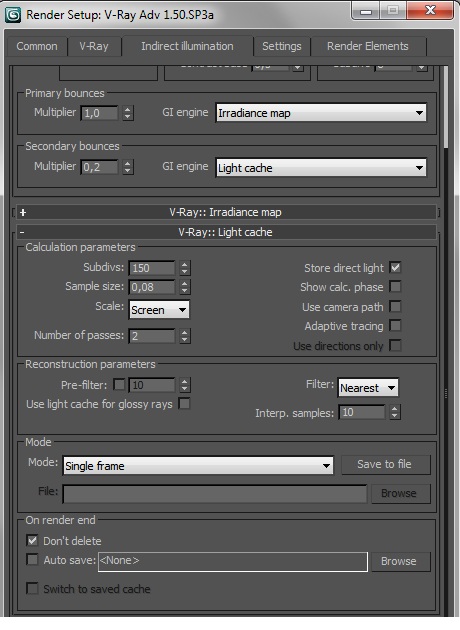 Además, se notan todavía menos las texturas porque para agilizar el renderizado puse en Light Cache, subdivisiones 150, entre otros parámetros que se los adjunto también.
