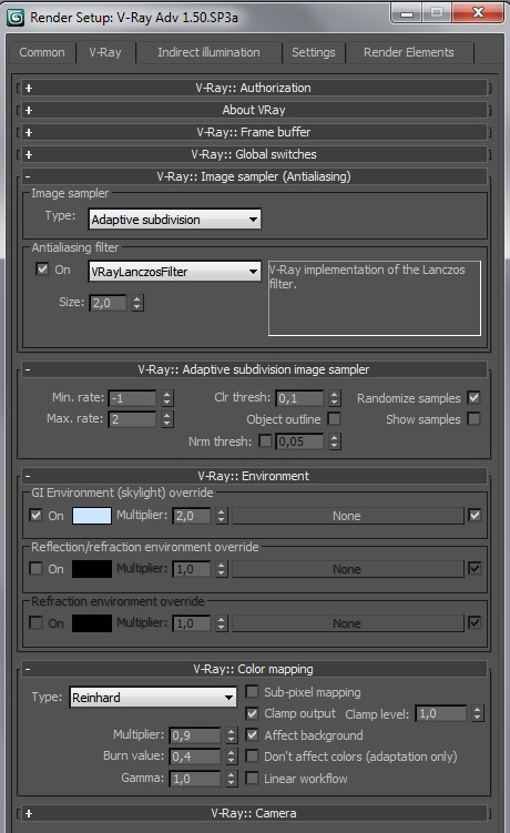 Hola Alf. Le puse 1 Vray light y Vray Sun, pero cámara no le metí.