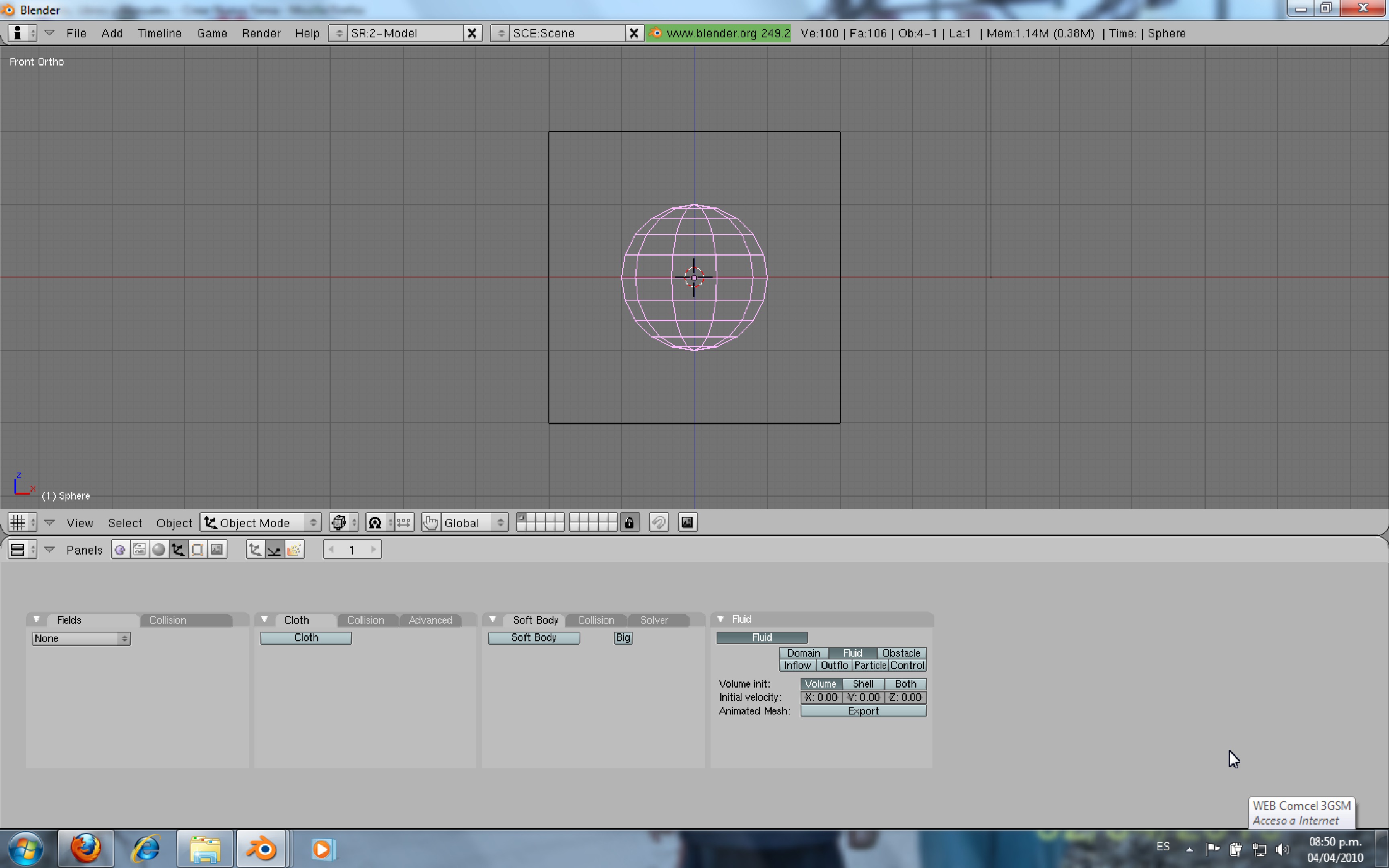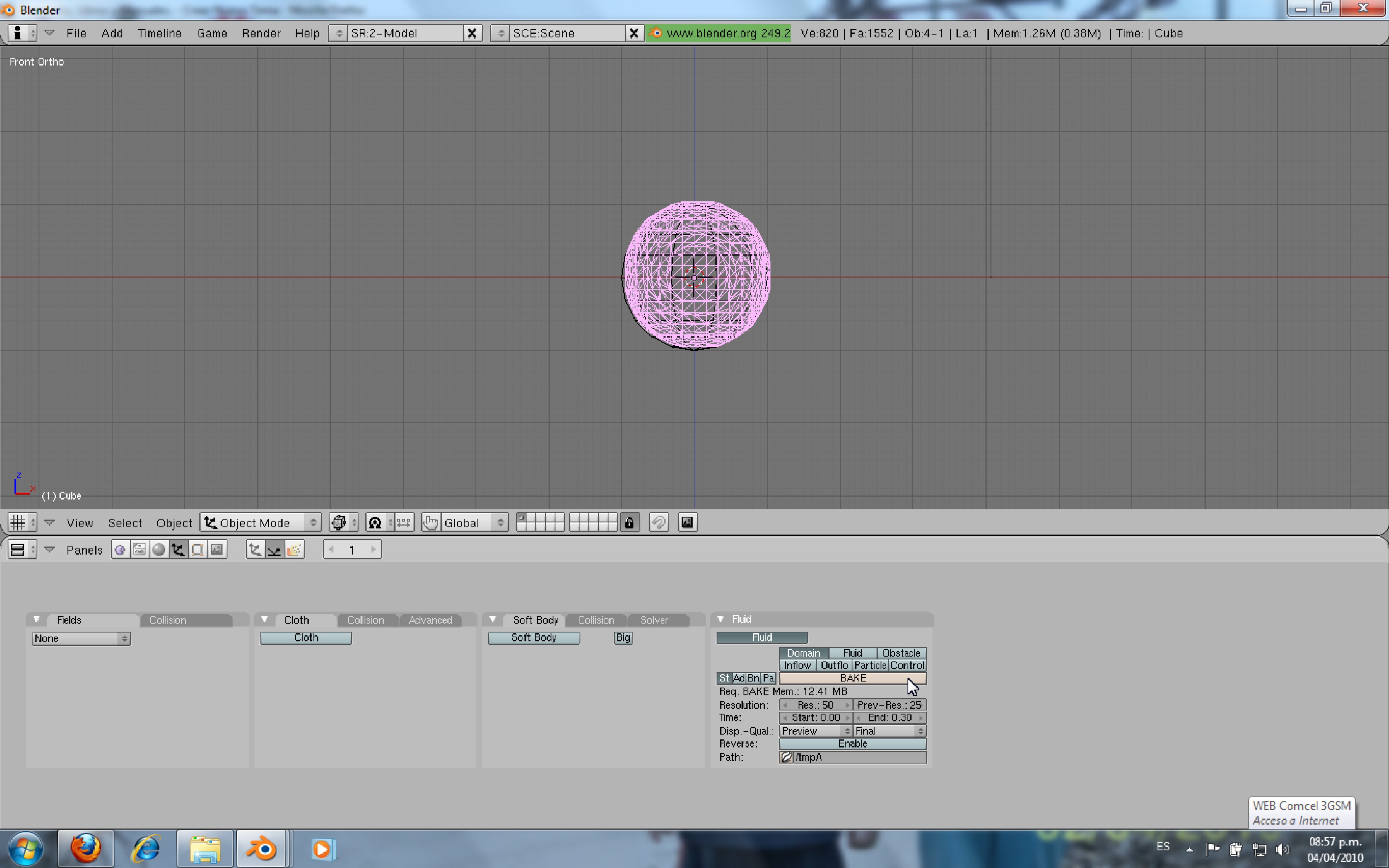 Activamos el botón fluid y luego el botón domain si queremos aumentar detalles de la animación colocamos resolution: res: 150, luego seleccionamos la UV sphere activamos el botón fluid y luego el botón fluid