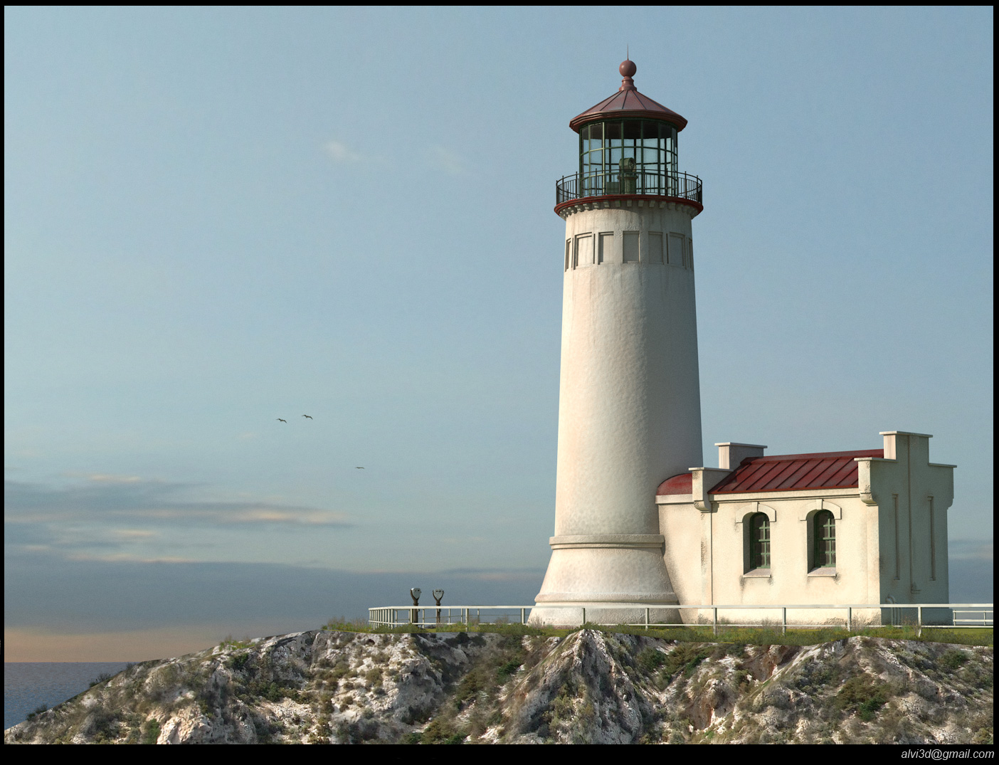 Para variar, que siempre subo imágenes de máquinas, esta vez algo de arquitectura. Vi unas imágenes de unos faros, me gustaron y me propuse hacer uno. Está hecho con Cinema 4D.