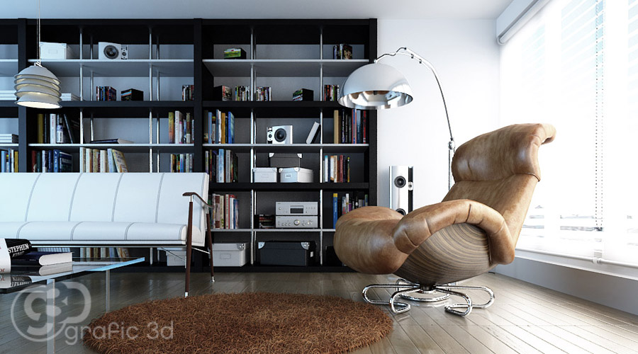 Muy buena la iluminación, pero coincido con javoc, ese sillón, parece que al sentarte te vas escurrir, yo le metería un material del cuero rugoso para darle más vida. Un saludo.