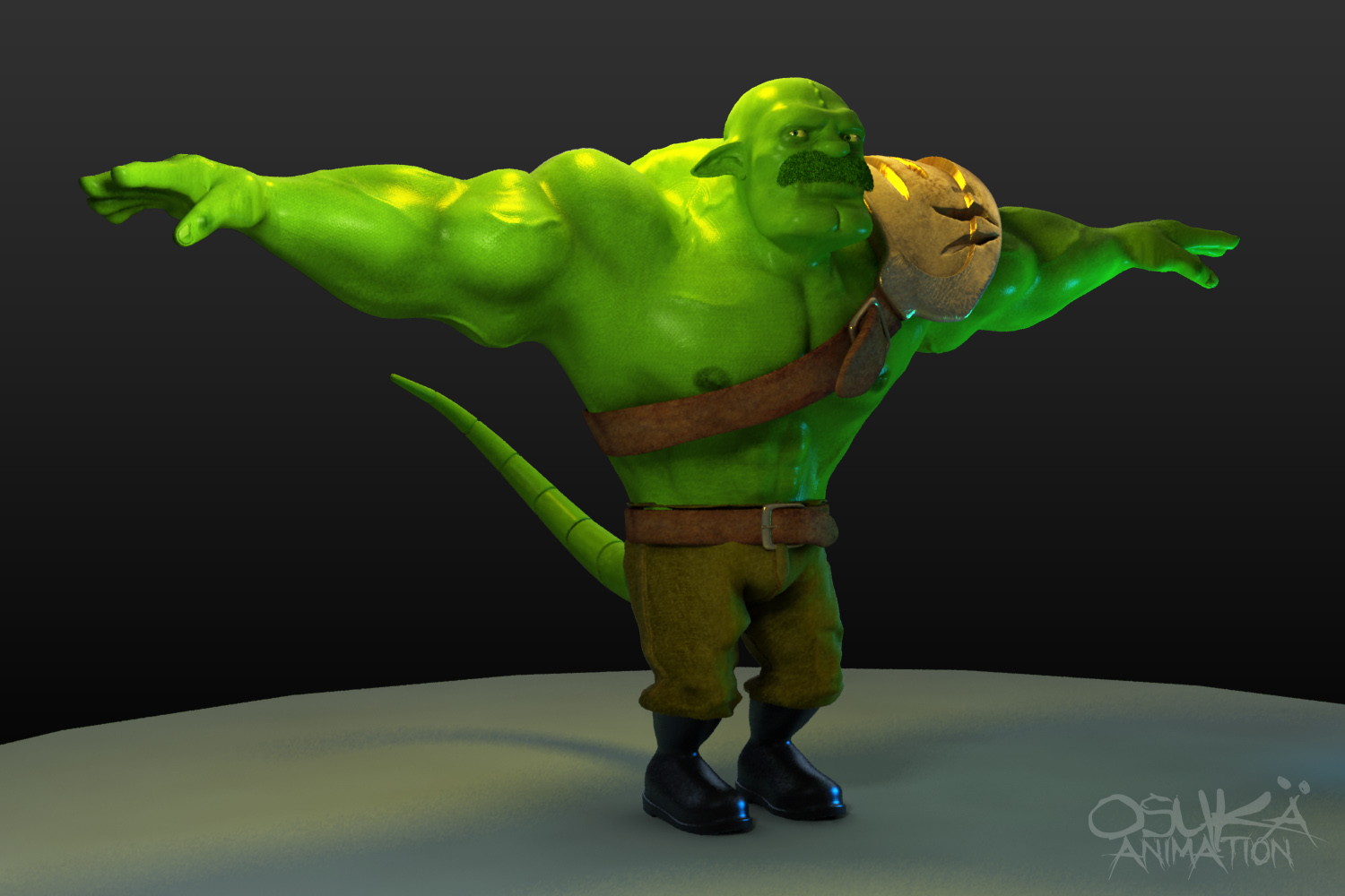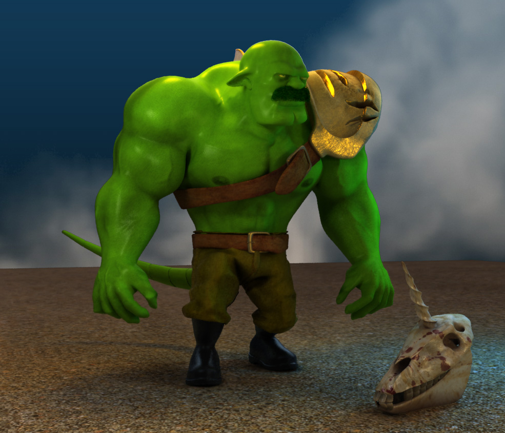 Muy, muy bueno tu personaje, no veo detalles, y la referencia demuestra el porqué del color, lo del fondo, es algo que va de acuerdo a la idea de cada persona, a mí me parece que así, ¿cómo se ve en la composición final, está muy bien. ¿hay intervención con ZBrush? Excelente trabajo osuka, a ver cuándo vemos más material tuyo por aquí. Saludos.