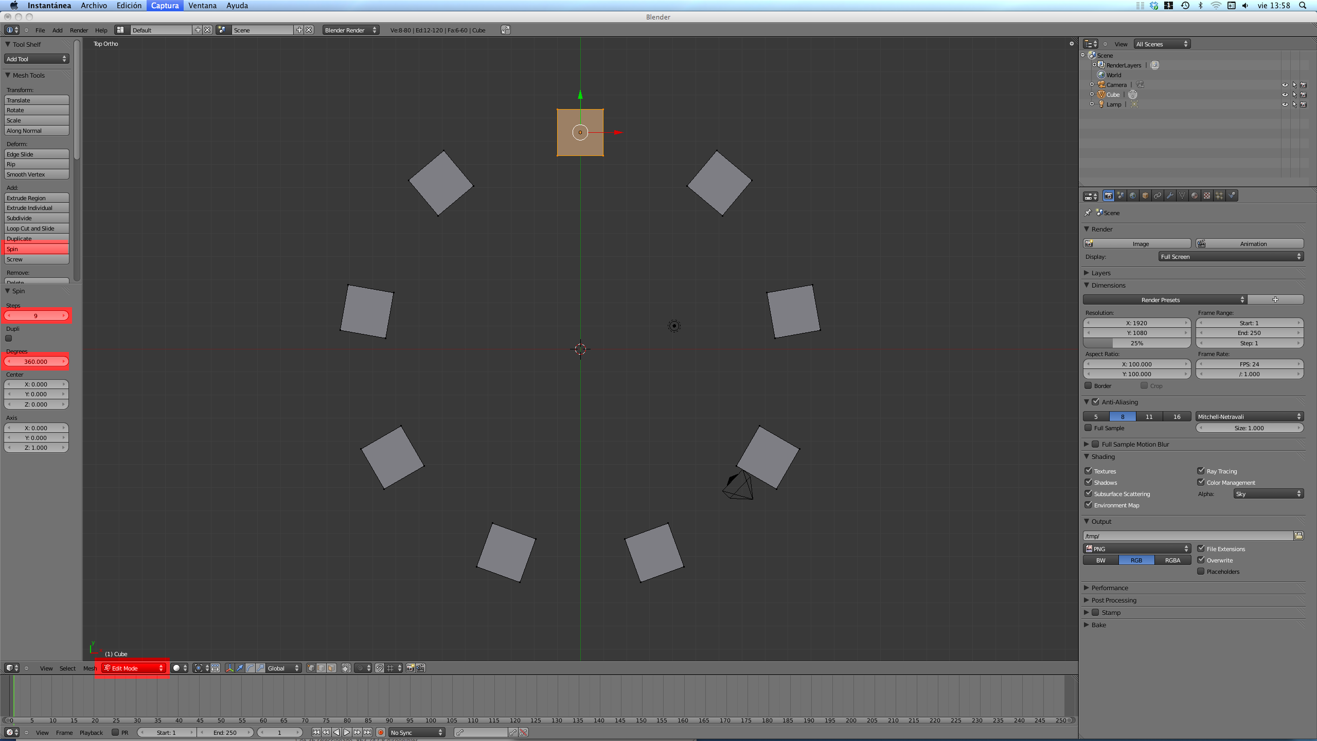 Hola. Hacía ya mucho tiempo que no escribía en el foro. Recientemente he vuelto a modelar en 3d para un trabajo de clase. Antes, (hace años), modelaba con 3ds Max pero ahora estoy obligado a hacerlo en Blender. Tengo que distribuir unos rectángulos en círculo, como si fuesen rayos que salen de un punto central. Mi pregunta es: