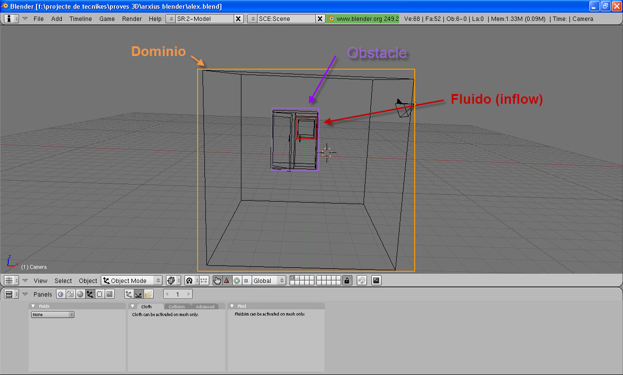 Pero cuando hago el dominio, el fluido (inflow) y el obstacle que sería el armario y después le doy al bake no me hace el fluido o me hace un fluido pequeño y sin animación alguna.