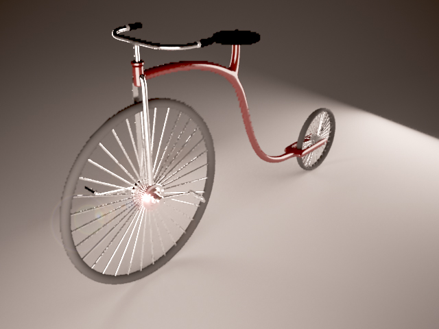 Bueno hice la bici, pero te la pasé con muy mala calidad al final, tampoco me esmeré mucho, la volveré a hacer y haber que sale, un consejo, en las ruedas, si pillas los polígonos de dentro donde tocan los radios(las varas de la rueda), y les pones otra id y esa parte le pones material de metal, alumino, del mismo que las varas, puede que de un poco más de realismo, aunque tienes que tener en cuenta que el fotorrealismo se lo tienes que dar con los pequeños detalles y en la postproducción, bueno, no es que sea un experto, pero eso si lo sé, igualmente el modelo de la bici mola yo me daba vuelte e.