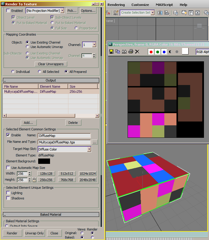 Hola, tengo un modelo que me baje desde la librería de Google SketchUp, el modelo tiene sus materiales asignados, lo exporte a 3ds Max y lo importe perfectamente con sus materiales, pero cuando abrí el editor de materiales me di cuenta que el material no está hecho con texturas, más yo necesito exportar el material como una única textura para poder importarlo en el motor de mi juego, como hago para exportar el material a bitmap desde el material que está en el material editor de 3dsMax? Gracias de antemano por su ayuda.