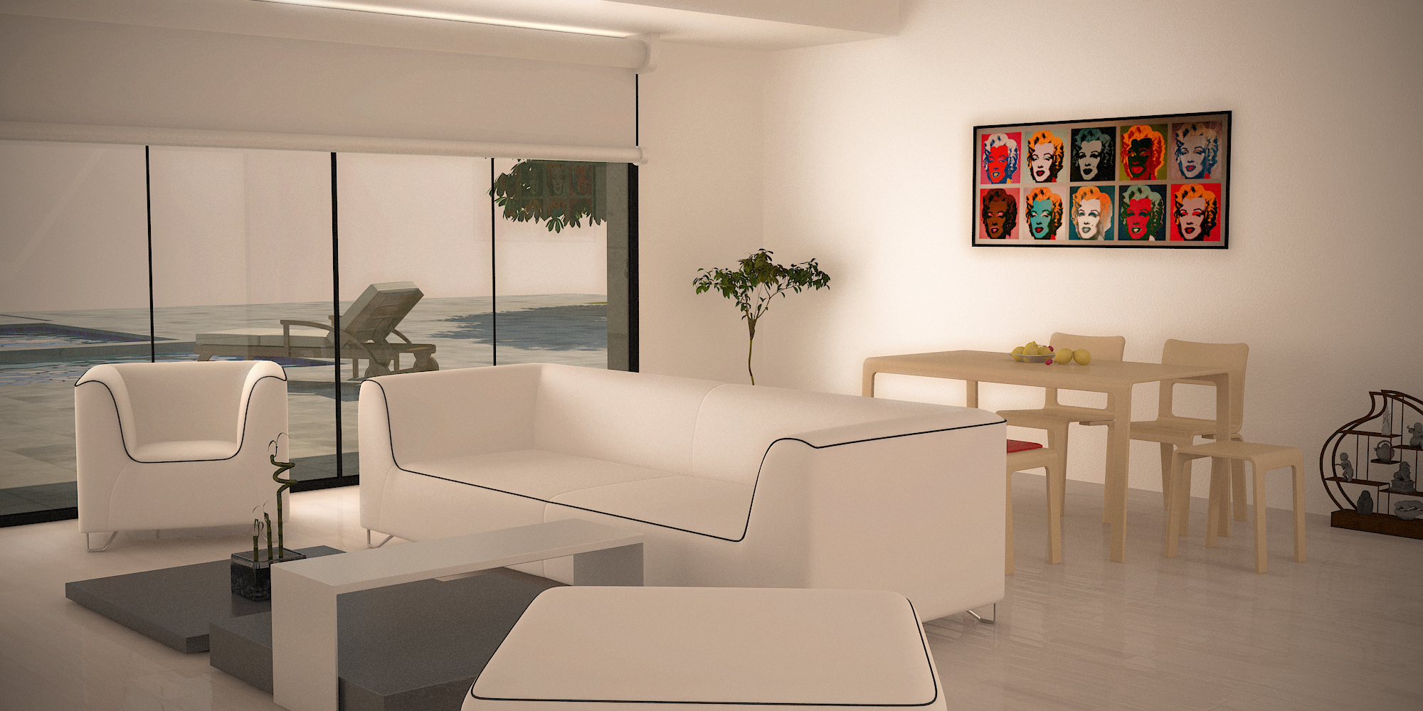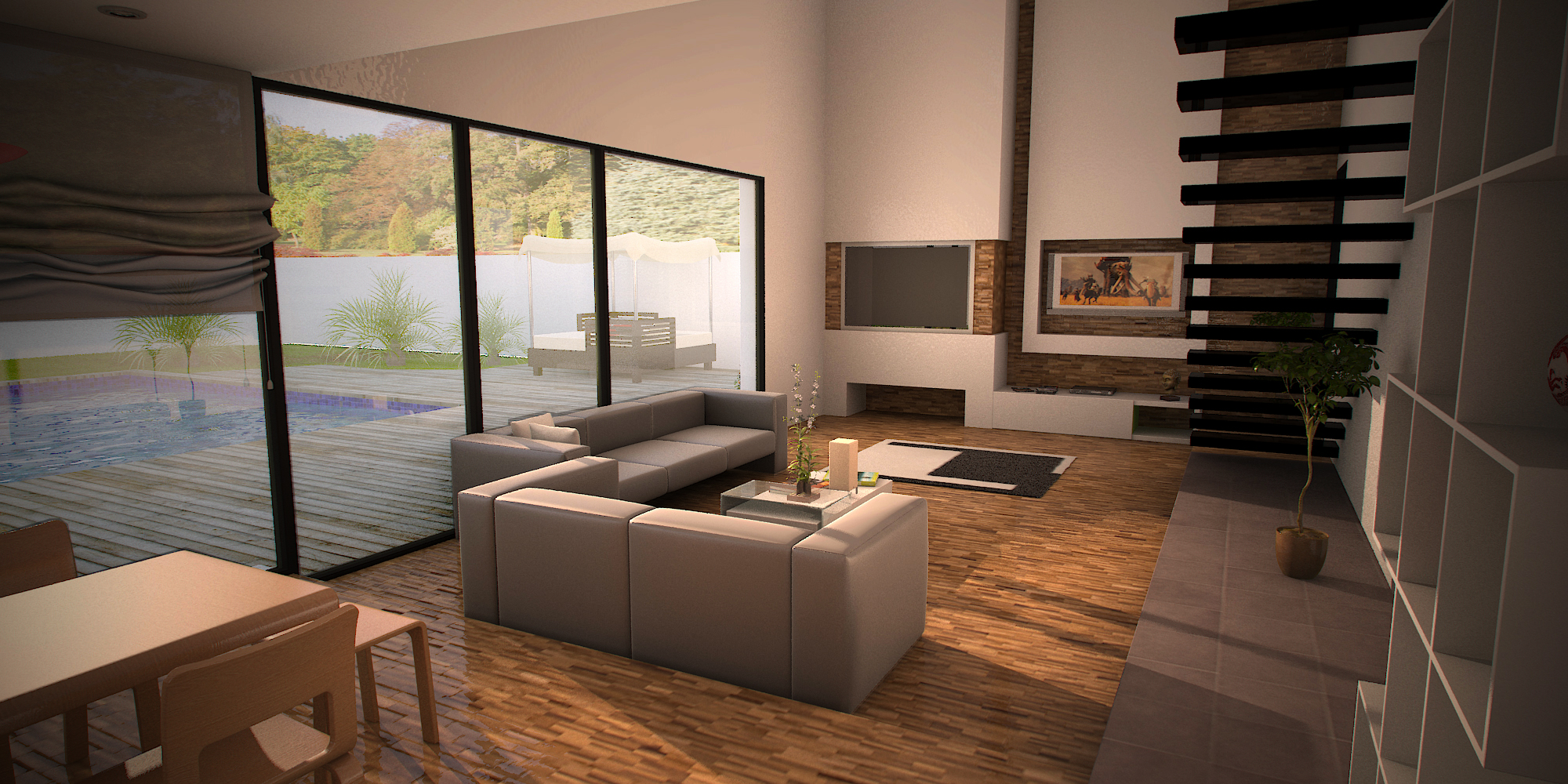 Son de otra vivienda, ya que la que puse anteriormente me daba fallos, y creo que era por haberla modelado con AutoCAD, a partir de ahora, paso de AutoCAD para modelar, como novedades, pues he aplicado una imagen de fondo, que se puede apreciar en la imagen interior, como me indico o3real, aunque creo que lo he hecho un poco cutre, y se nota la imagen estirada, tendré que mejorarla, también hay algún fallo en la textura de la pared, porque creo que le he dado mucho brillo y el noise es muy grande, pero bueno, también mejorable, la zona de la chimenea y televisión es idea de una escena que he visto en Evermotion creo.