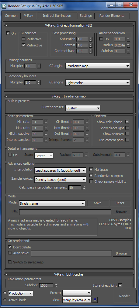 El Irradiance Map, no juegues con él, ponlo en Low para pruebas, y en medium para final, es solo un mapa donde se guarda el acabado de la luz sobre los objetos, como una textura, así que, no necesitamos andar tocándolo y menos cuando no sabemos, y para un exterior donde apenas pide detalle menos aún.