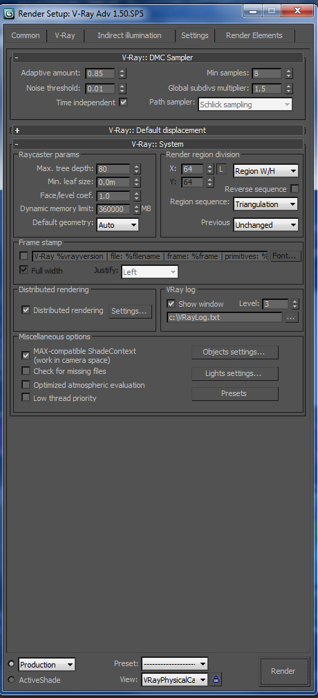 Hola, os dejo esta imagen de un exterior nocturno que me ha dado una sorpresa al renderizar. Publico setting de v ray, la iluminación viene dada por omnis, los RGB de algumos jps en los materiales y un cielo puesto en el environment con el RGB subido a 30.