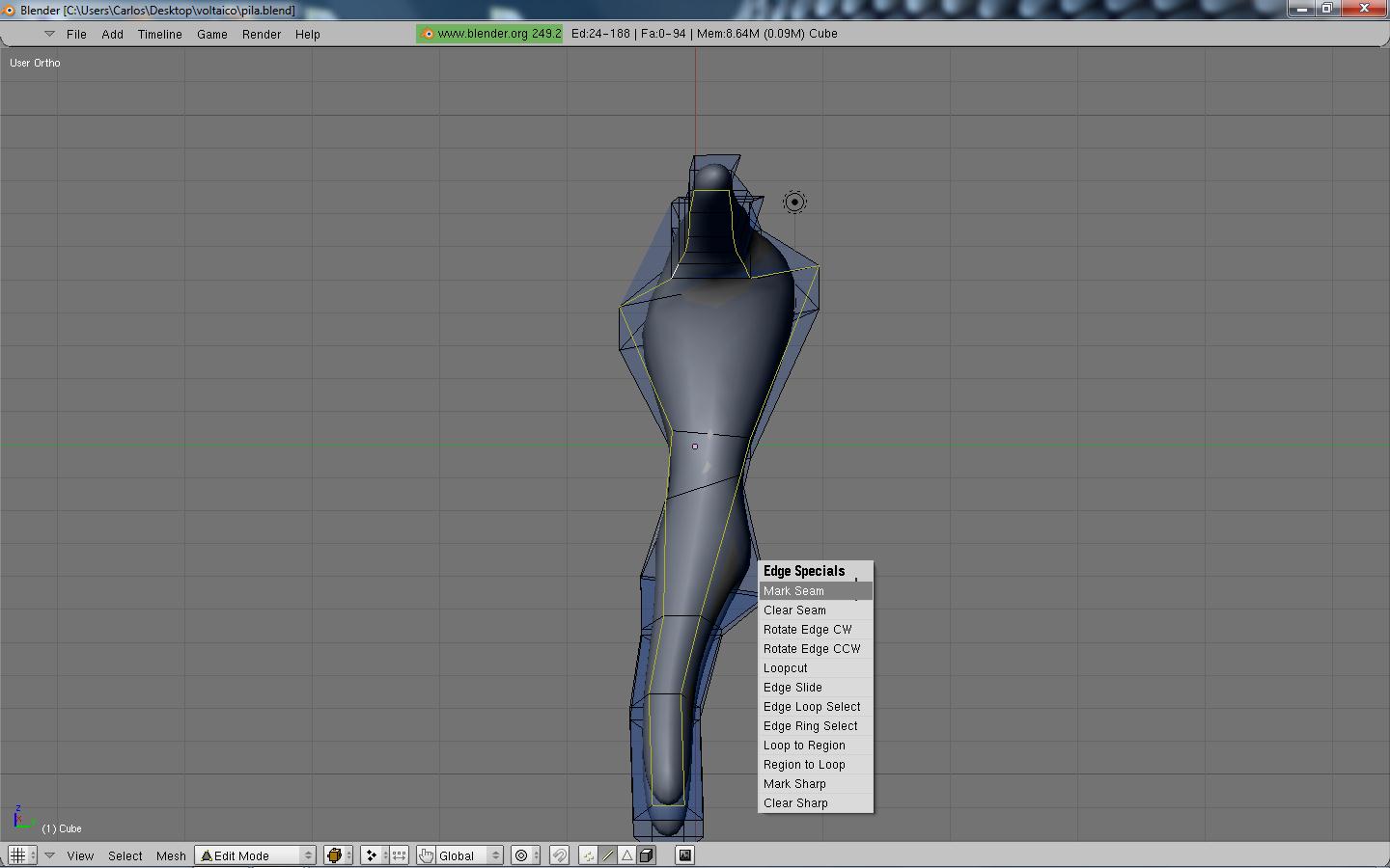Hacemos la misma operación en el otro extremo seleccionando los Edges y luego Control + e dando clic en marque seam.