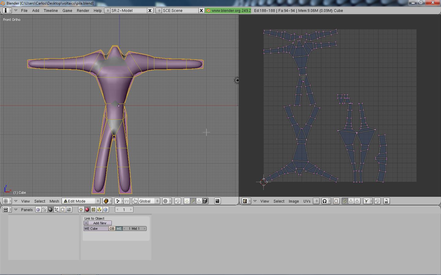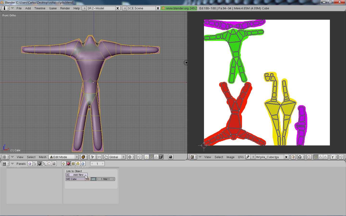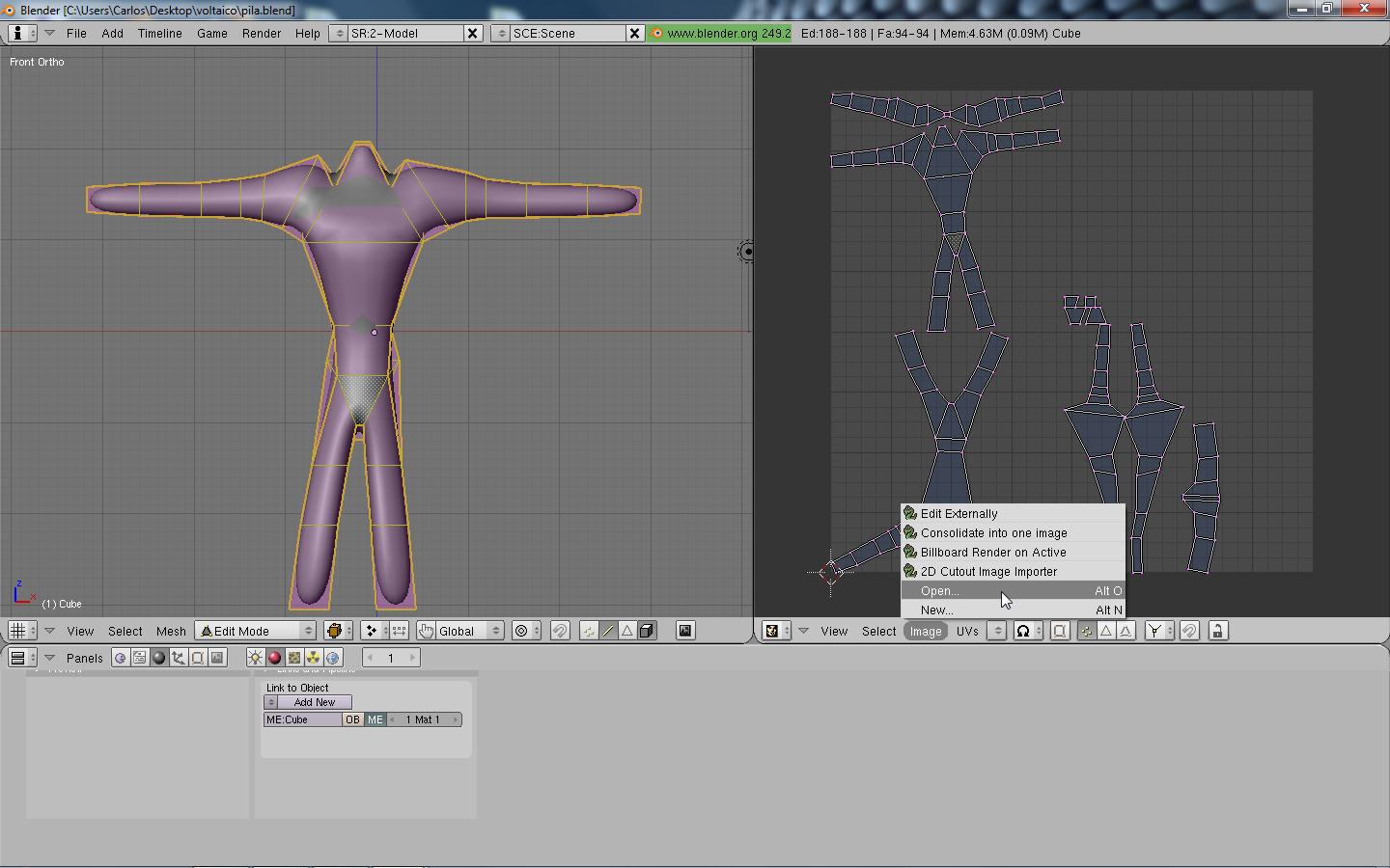 En la ventana UV/Image Editor aparecerá nuestro personaje en retazos justo por dónde le metimos la tijera.
