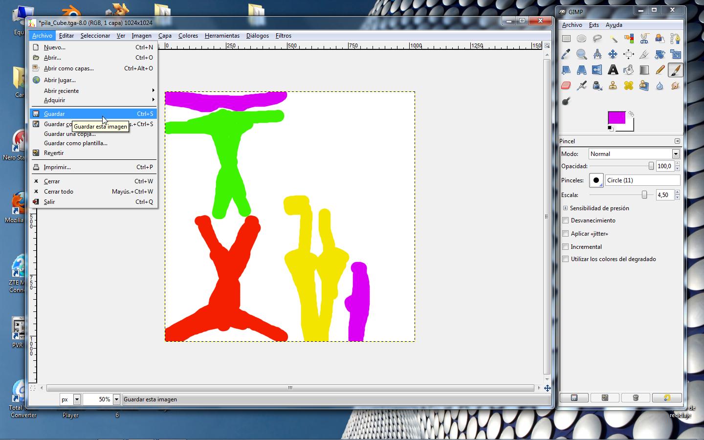 Pintamos la imagen a nuestro gusto, en lo posible no usar la herramienta de relleno, ya que entonces se notaran los alambres al envolver nuestro personaje, tal vez el comentario no vaya bien en este tutorial, pero a mí me paso repetidas veces, en este ejemplo usé el pincel e hice un pintado básico a la imagen y guardé los cambios.