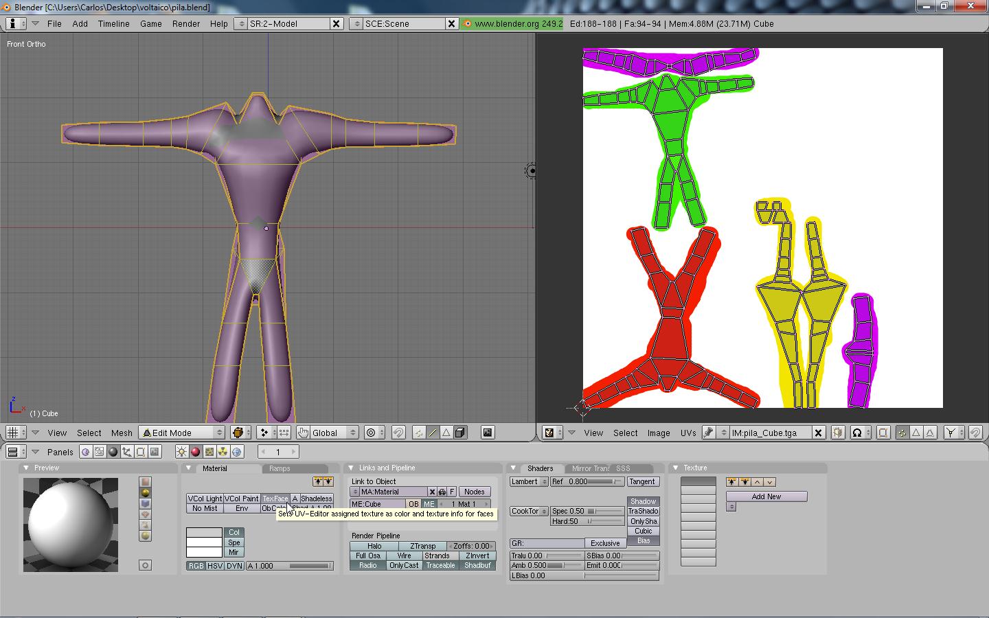 Y activamos el botón Texface del material para que nuestro personaje quede envuelto en la textura que cargamos.