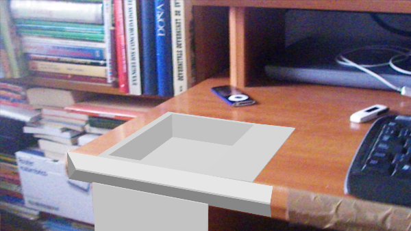 Hola ertosmasillo, pues para algo así se pueden hacer varias cosas, si eso para una imagen solo creo que es más rápido hacerlo con el Adobe Photoshop, si es para un video tendrías que crear un objeto que lo cubra en 3d(algo parecido a la madera de la mesa, pero que solo tape la parte que se vea) y le des al objeto y al fondo un material constante, que luego en mensaje preoduccion se elimina fácilmente quedado transparente.