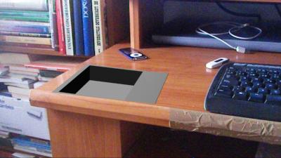 Hola buenas, estoy piracticando para hacer un agujero en mí mesa de escritorio, entonces lo que hago es un cubo al que le hago un hueco, pero el problema es cuando oculto las caras, que se ve el fondo, para que me entendáis os dejo 2 imágenes.