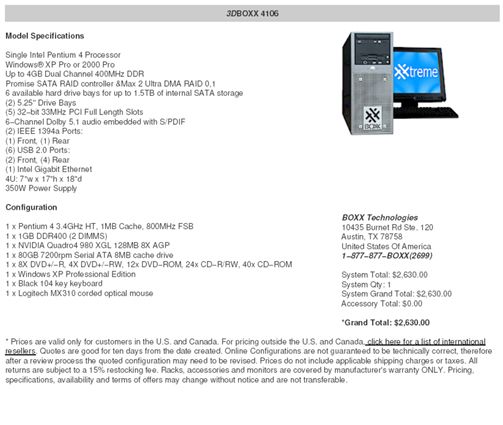 He puesto solo 1 Gb de Ram (ec, de ahí el precio, 30 euros más cara que la normal) porque es lo que más varía de precio dependiendo del país, así no te llevas una sorpresa si la memoria es mucho más cara de lo que yo pongo. La gráfica ha sido un verdadero reto porque son 849eur y no es lo último de lo último, es una elección basada en como esta la competencia, gastarse el mismo dinero en Ati es como tirarlo por la ventana y gastarse más dinero en cualquier cosa que Nvidia pueda ofrecer es un lujo a mi modo de ver innecesario, solo grandes estudios pueden necesitar una Quadro FX 3000, el resto nos lo pasaremos muy bien viendo la cantidad de polígonos que puede mover, pero no le sacaremos el partido necesario para amortizar los 1500 euros que vale.