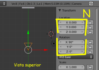 En la imagen que subo, es una captura desde vista superior, y se ve como la cámara mira hacia delante y está situada en el centro de la escena.