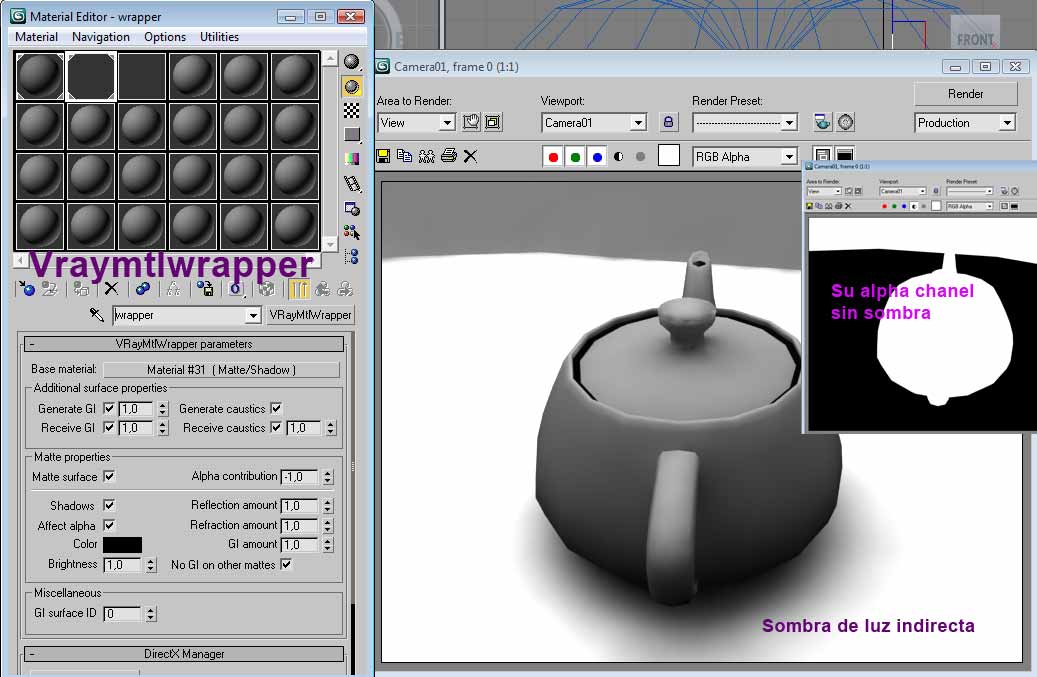 Hola a todos. Estuve averiguando últimamente como renderizar un objeto con su sombra sin que se viera el plano dónde está era proyectada para poder llevármelo al Photoshop e integrarlo donde yo quisiera. Y averiguando aquí y, allá aprendí el uso del material vraymatlwrapper para este fin. Pero cuando pensé que ya todo estaba solucionado, descubrí que no me tomaba la sombra en el plano si las luces (utilicé vraylights) eran rebotadas hacia las paredes para llegar en forma difusa a mi objeto. Es decir, ninguna de las luces apuntan directamente a mi objeto, más bien apuntan al lado opuesto y son rebotadas hacia el objeto por las paredes de mi escena. Veo claramente las sombras sobre el plano en la ventana del render, pero si hago click en display Alpha Channel no se ve la sombra y tampoco en el (*.png) resultante. Mil gracias por cualquier ayuda.