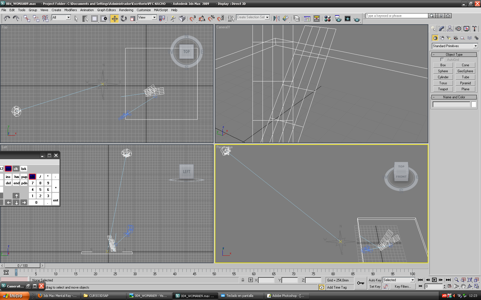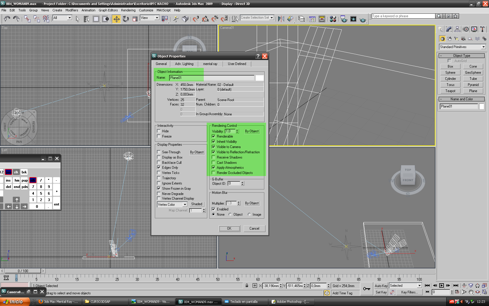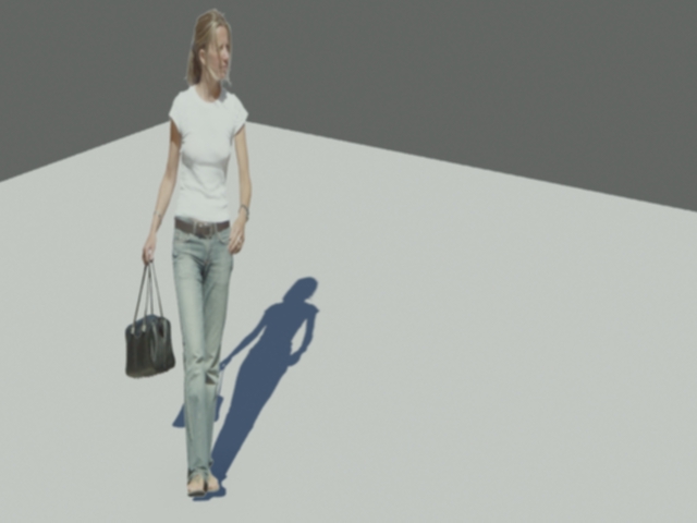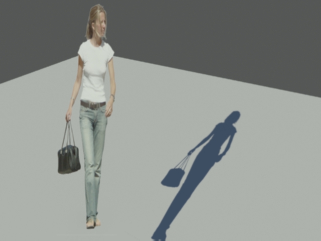 La persona -plane 1- Con la sombra del plane 2 -que es el que tiene el comando Look At referido al Daylight, para que la proyección de la sombra sea máxima siempre. Como se puede ver, Mental Ray renderiza un cacho del plano (las piernas de la chica), y eso no debería aparecer ahí, ya que esta marcado como no renderizable.