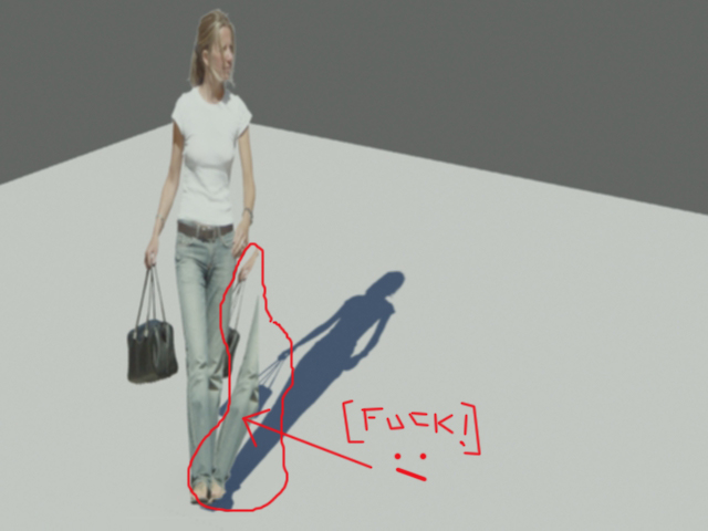 La sombra del segundo plano se proyecta sin problemas sobre el suelo. Pero dependiendo de la posición de la cámara, el programa a veces me renderiza -con la textura de la persona- El plano de sombra que esta marcado como invisible para la cámara. Además, no lo renderiza entero. Parece como si tuviese algún conflico con la intersección de los dos planos creados -el de la persona, y el de la sombra-. :/ x 1000.